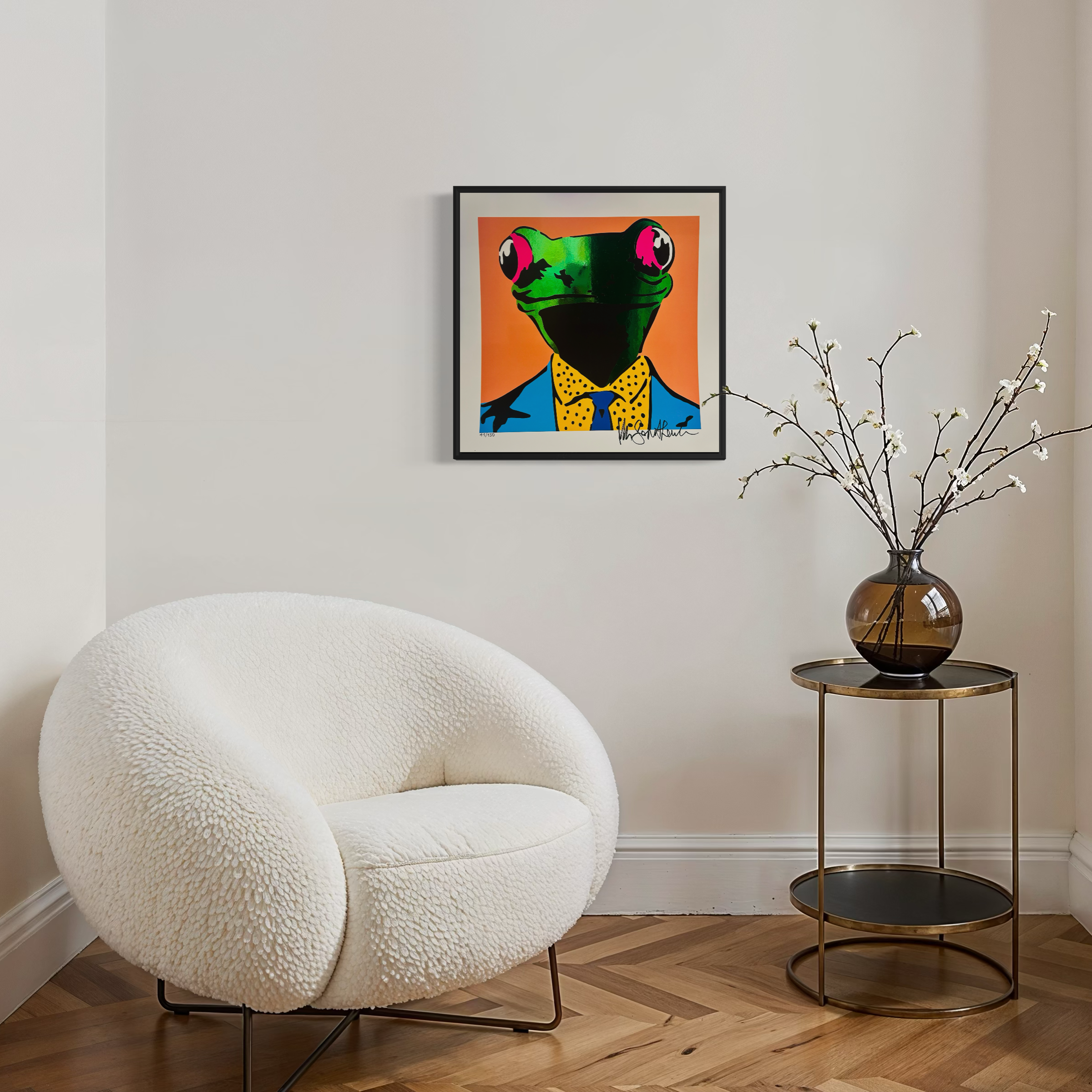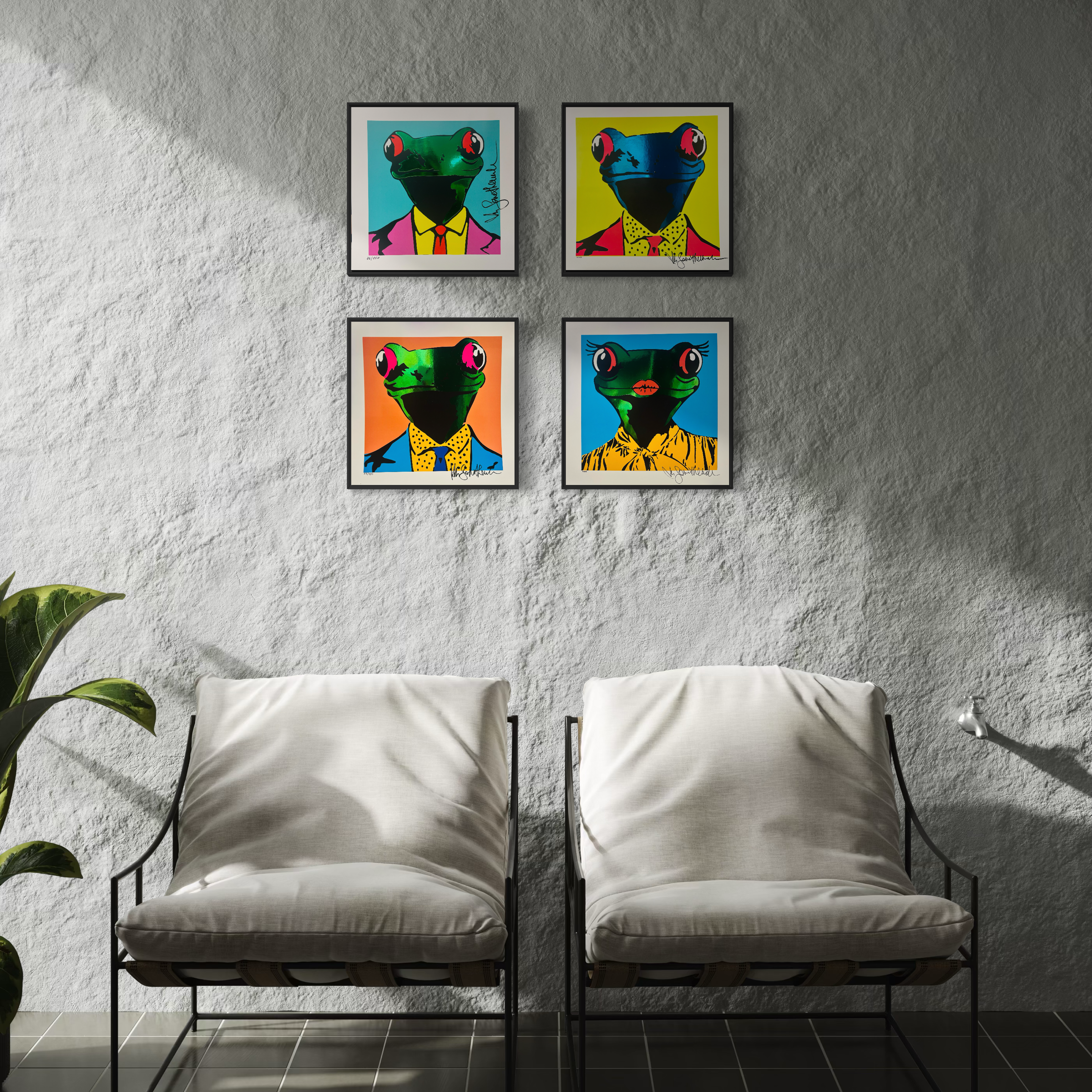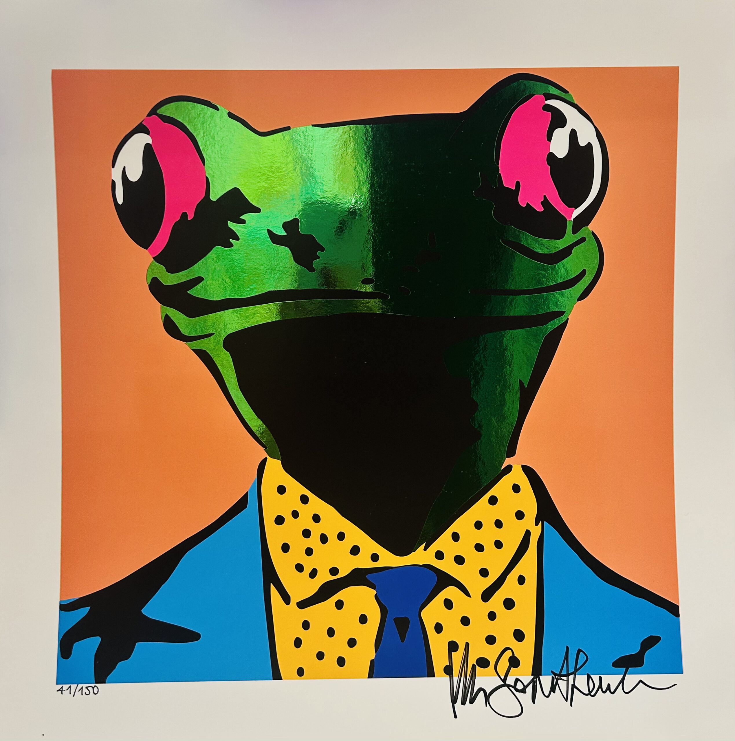 “Astro Frog” è la serie serigrafíca firmata Mr. Savethewall che trasforma una rana in un personaggio metropolitano, elegante e irriverente allo stesso tempo. Vestita in abiti dal gusto vagamente retrò, con quegli occhi enormi e inespressivi tipici del linguaggio pop, la rana di Perretta non è un semplice soggetto: è uno specchio distorto e divertito della società contemporanea.