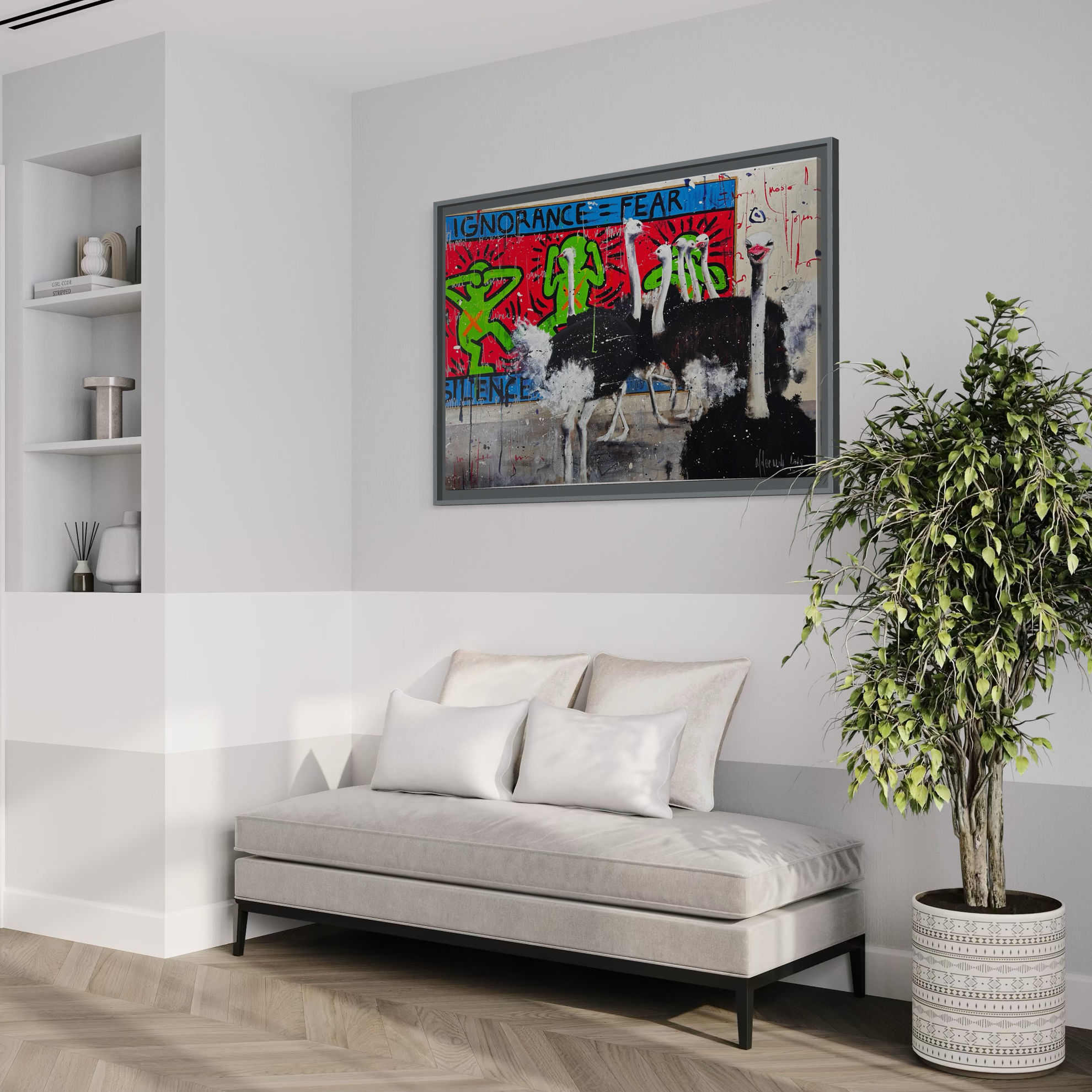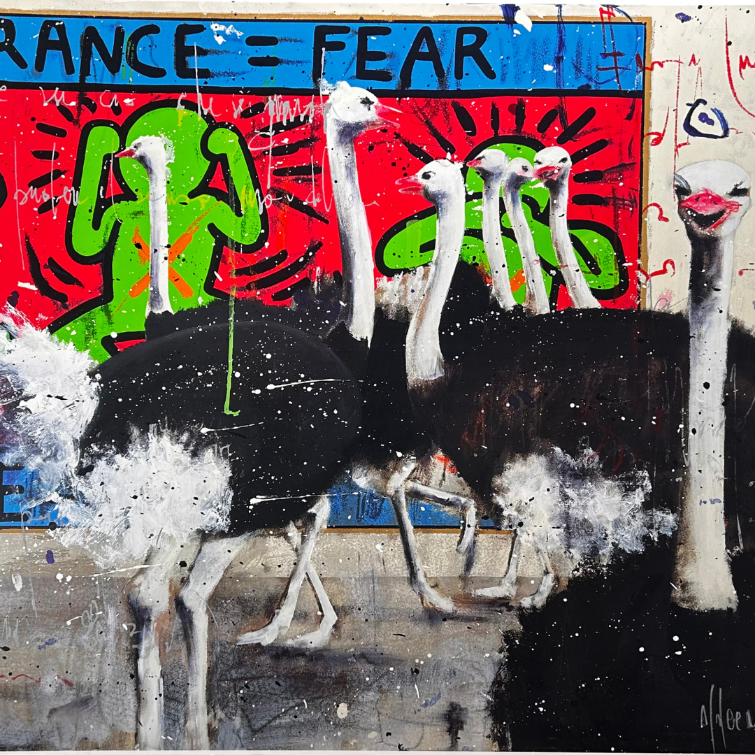 In quest'opera Accardi pone il suo “avvenimento di struzzi” davanti a una celebre opera murale di Keith Haring, dove campeggia la frase “Ignorance = Fear, Silence = Death”. Il messaggio sociale di Haring — contro l’indifferenza e l’ignoranza — trova un eco ironico e attuale nella presenza degli animali che, simbolicamente, scelgono di “non vedere”.