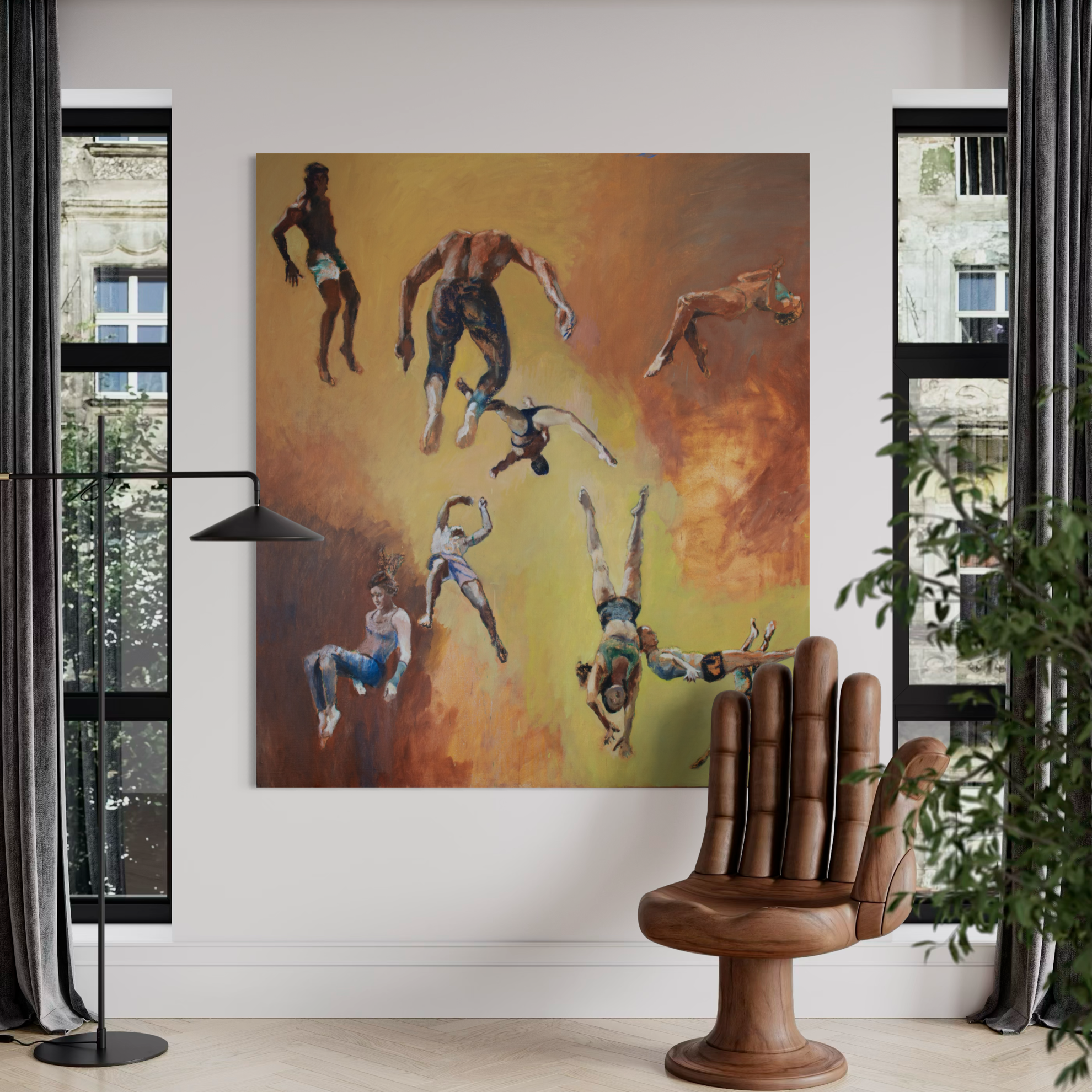 L’artista inglese Nicholas Stedman,nelle sue opere, prende ispirazione dal film omonimo “Le gran bleu” di Luc Besson del 1988, che narra il dualismo di due apneisti di fama mondiale, Jacques Mayol ed Enzo Maiorca. I protagonisti del film, primatisti nella scena sportiva contemporanea che, si sfidano a colpi di record, vincendo i propri limiti con la pura forza della volontà e della passione. Una sfida di uomini-delfini che raggiungono risultati sorprendenti, rimasti nella storia, rendendoli memorabili ancora oggi. Simboli di resistenza, di coraggio e di ambizione, i nuotatori di Stedman sono figure sempre attuali, simboli di valori eterni che animano il pensiero e la volontà dell’uomo in un inarrestabile processo evolutivo che spinge il proprio orizzonte sempre più in avanti. Coraggio, fierezza, forza potenza, equilibrio e leggiadria sembrano intrecciarsi perfettamente nelle composizioni figurative realizzate da Stedman su sfondi quasi monocromatici, in cui il colore predomina nella sua purezza.
