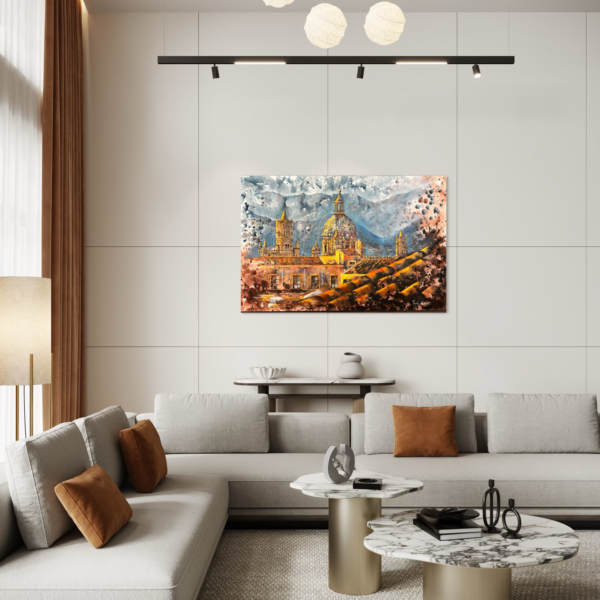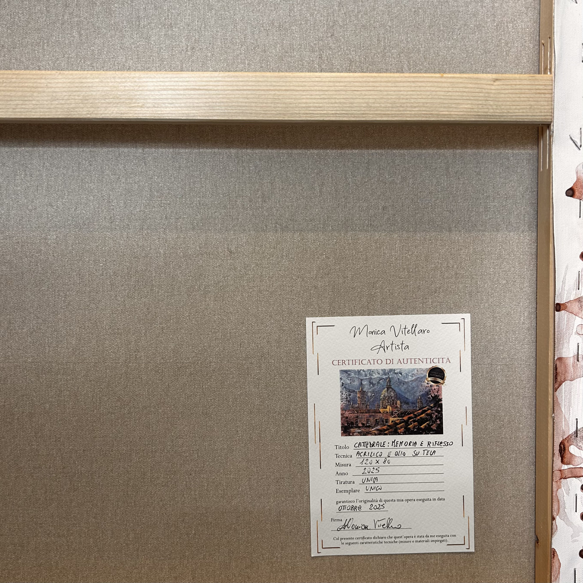 L’opera ad acrilico e olio su tela di Monica Vitellaro raffigura la Cattedrale: Memoria e riflesso in una visione calda e luminosa, dove l’architettura sacra emerge tra i tetti aranciati della città e le montagne sullo sfondo. L’artista adotta un procedimento di stratificazione, partendo da un fondo materico in cui i colori sembrano sporcare la tela, generando velature e segni che si confondono con la composizione finale. Questa tecnica dona profondità e dinamismo all’immagine, fondendo realtà e suggestione. L’uso di toni caldi e terrosi, alternati a sfumature fredde del cielo, restituisce un’atmosfera intensa e vibrante, capace di evocare la luce e l’anima di Palermo.