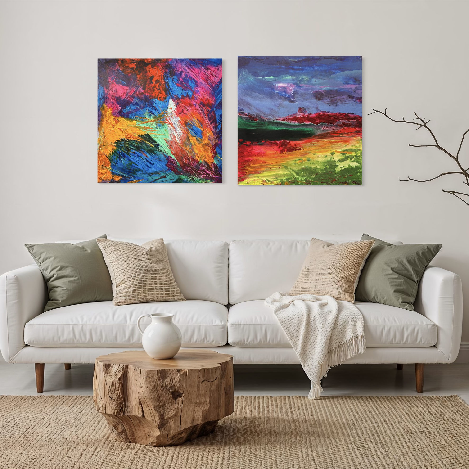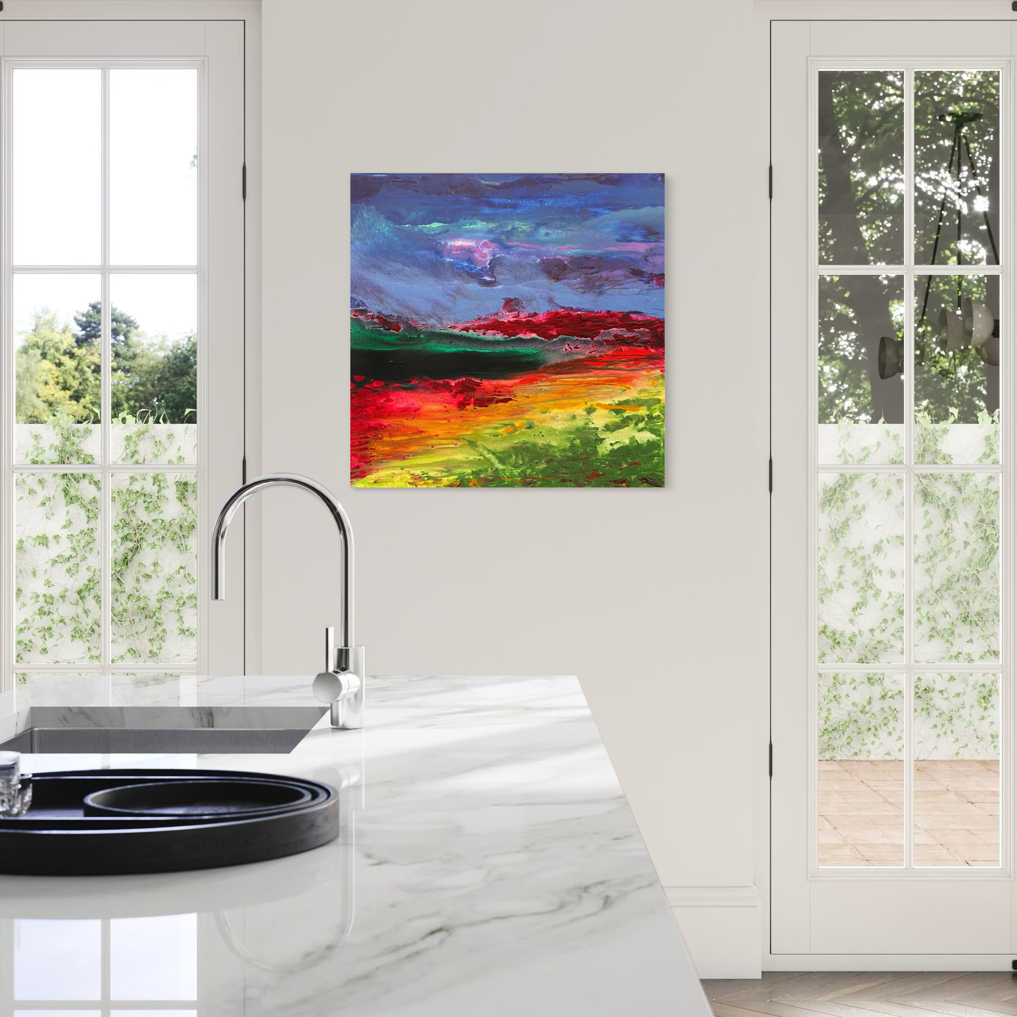 In questa opera, Schelfi intensifica la potenza espressiva del colore: il cielo si accende di sfumature violacee, azzurre e turchesi, quasi a evocare un tramonto cosmico, mentre la terra esplode in una sinfonia di verdi, fucsia, rossi e gialli acidi. La materia pittorica è più corposa e vibrante, con texture dense che suggeriscono un paesaggio vivo, in trasformazione. Anche qui, la separazione tra cielo e terra è superata: ogni colore sembra travasarsi nell’altro, creando un flusso continuo di energia visiva. L’opera pulsa di vitalità, affermando la visione di un mondo in cui la natura e l’anima si fondono in una medesima corrente cromatica e sensibile.