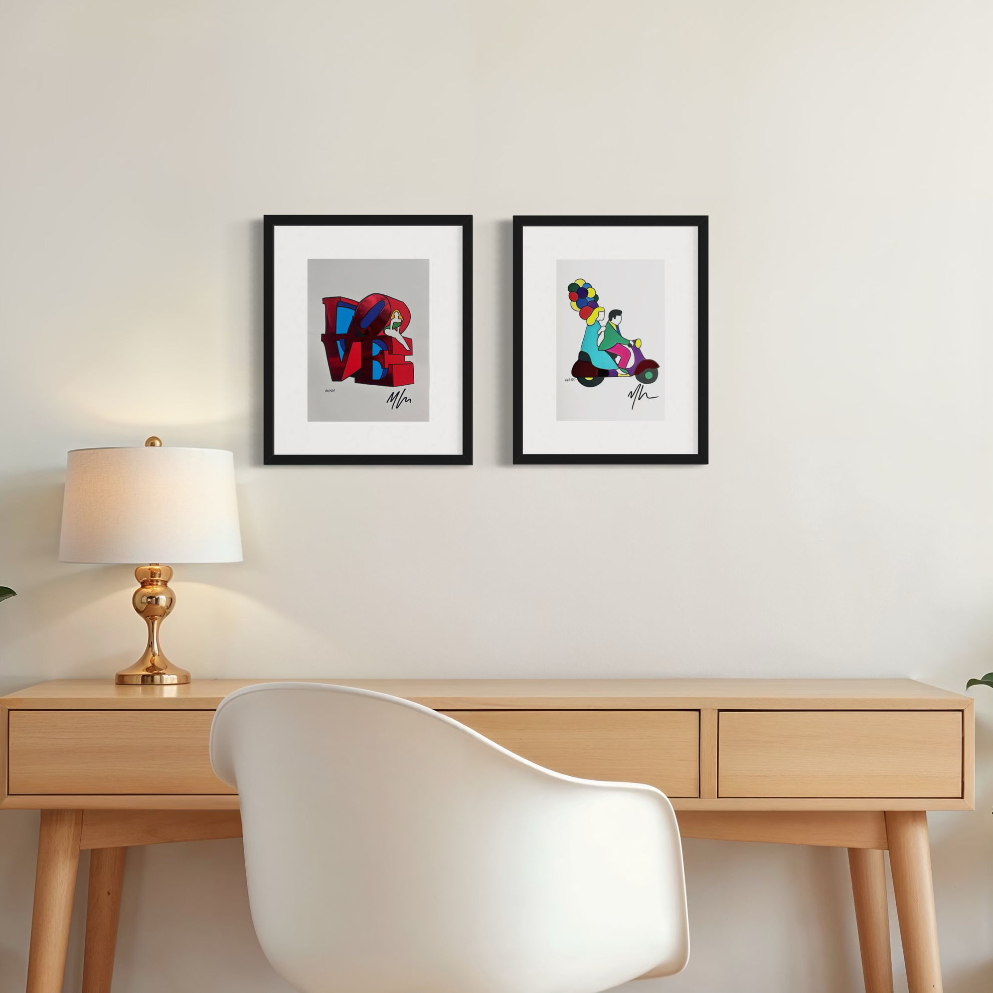 L’ultima serie di serigrafie di Marco Lodola celebra con vivacità e leggerezza l’immaginario iconico che da sempre contraddistingue la sua arte. I protagonisti sono riletti attraverso il consueto stile luminoso e stilizzato dell’artista. Le sagome, dai colori piatti e accesi, si stagliano su fondi neutri o intensamente saturi, evocando movimento, energia e spensieratezza.