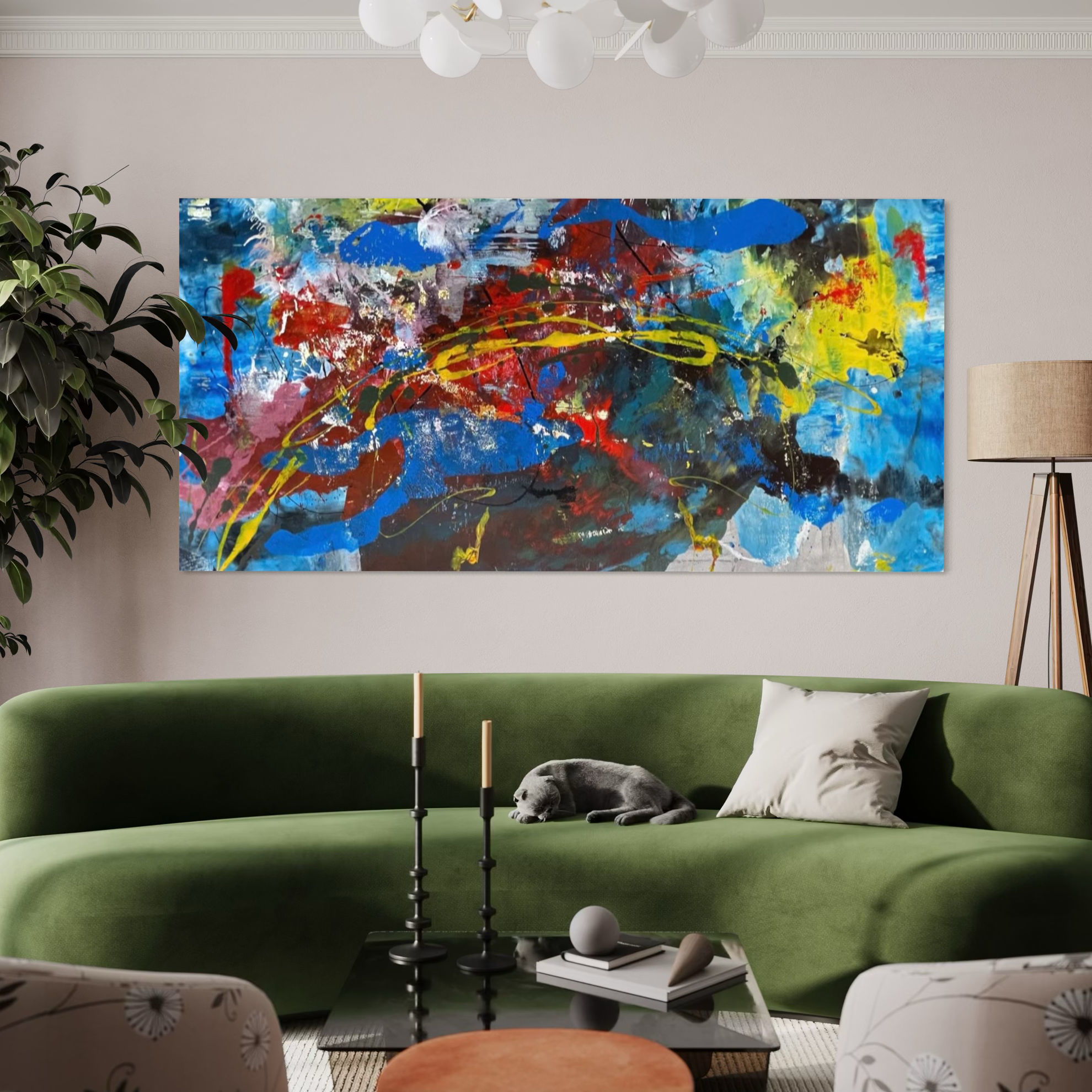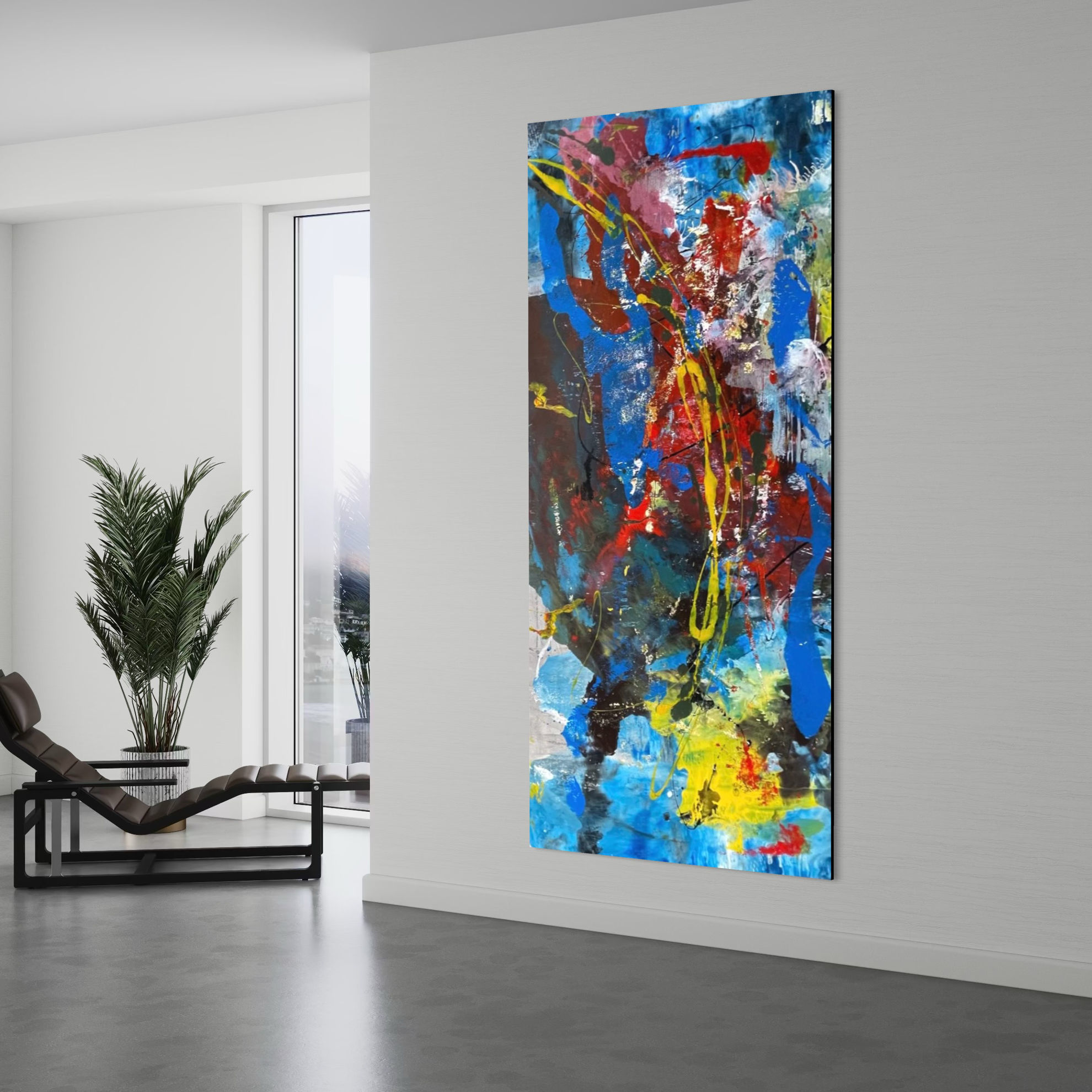 L’osservazione di Matteo Must, qui, si concentra sulle costellazioni, sull’intenso e vasto dispiegamento di stelle e astri che colorano il firmamento. Qui l’elemento aria è il protagonista, con tutte le sue forme di vita, di energia, di intense vibrazioni. Su uno sfondo blu, intenso e vivido, si squarciano raggi di luce come a illuminare la tela donando una visione astratta e libera dell’artista. Molto intenso il risultato, fortemente impattante, scenografico, secondo le corde del giovane artista Matteo Must che, oltre ad essere un promettente artista, vanta già una carriera di scenografo in cui l’opera rappresenta l’elemento protagonista dell’ambiente in cui viene inserita. “Costellazioni” è un’osservazione del cielo sconfinato, immenso, che non ha paura di guardare e di scorgere in tutta la sua contraddittoria bellezza. “Costellazioni” è una finestra aperta sui nostri ambienti verso spazi infiniti capace di donare profondità all’ambiente e uno sguardo incantato, una nota di magia e di stupore, una visione protesa verso un oltre.