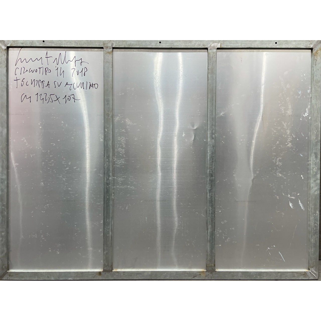 DESCRIZIONE Splendida opera unica di grande formato di Croce Taravella, tecnica mista su alluminio di misure 107x162 cm dal titolo "Cronotipo 14". Il dipinto è firmato nel retro, in nero, e riporta la data di esecuzione il 2020. L'artista, nei suoi “Cronotipi”, sviluppa una trasmissione interiore trasponendo il vivere contemporaneo sulle immagini cariche di simboli che rappresenta in una progressione di visioni che evidenziano l'evolversi esponenziale del suo pensiero secondo uno sviluppo cronologico attento e rispettoso delle esperienze passate, riproducendo una sorta di archivio della memoria con grande trasparenza e intensità.