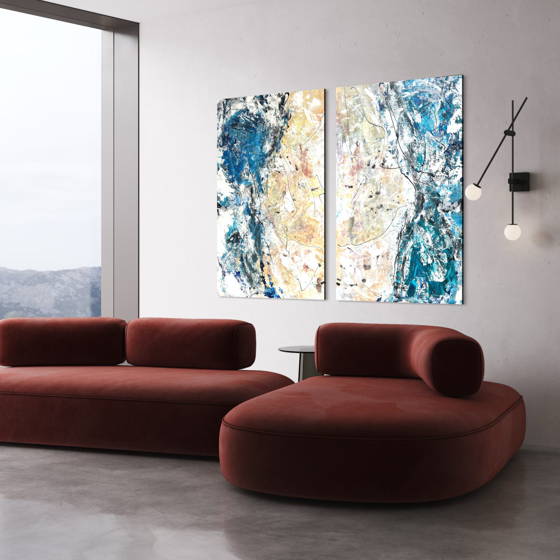La soluzione del dittico presenta l’opportunità di distanziare le due opere in base agli spazi disponibili e agli arredi sottostanti.