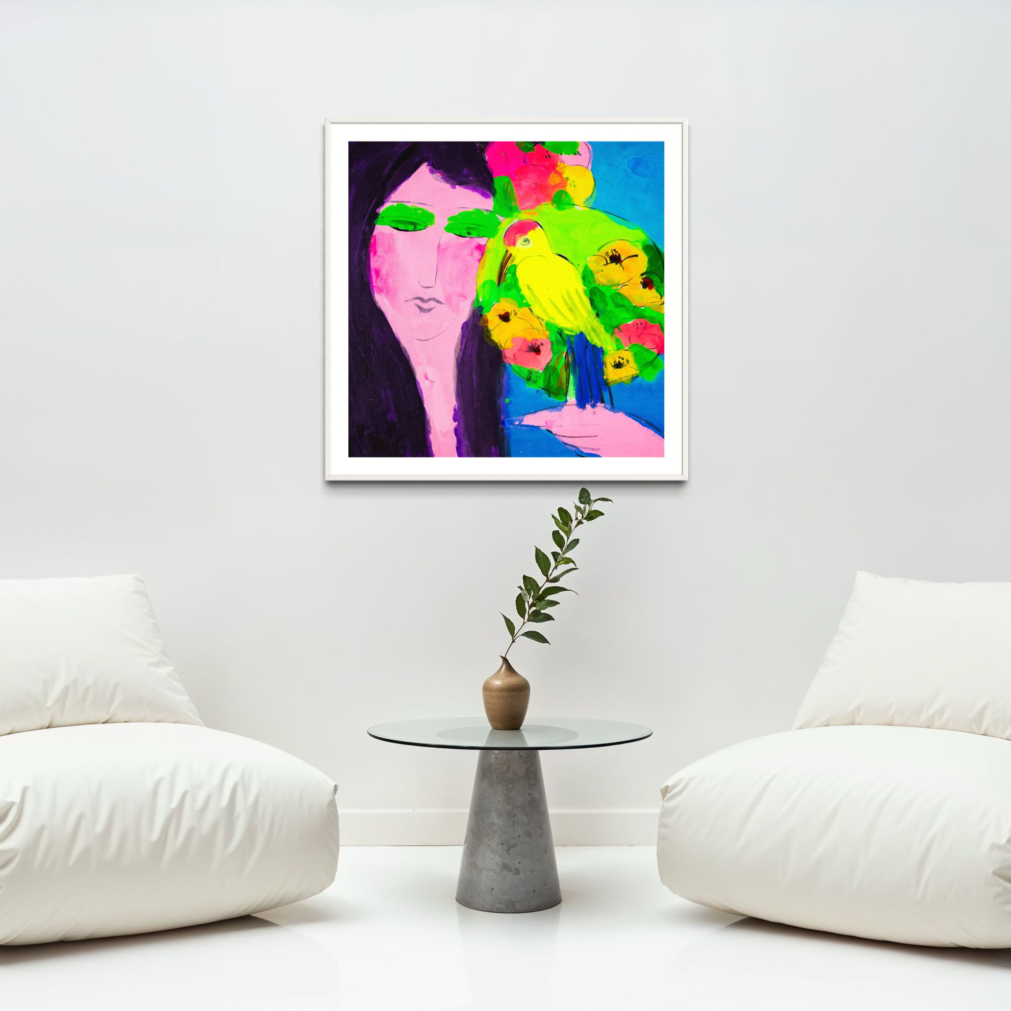 Ritratto femminile stilizzato, dominato da una gamma fluorescente di verdi, rosa e gialli. L’uccello tropicale poggiato sul bouquet contribuisce all’atmosfera vibrante e festosa, tratto distintivo della poetica visiva dell’artista.