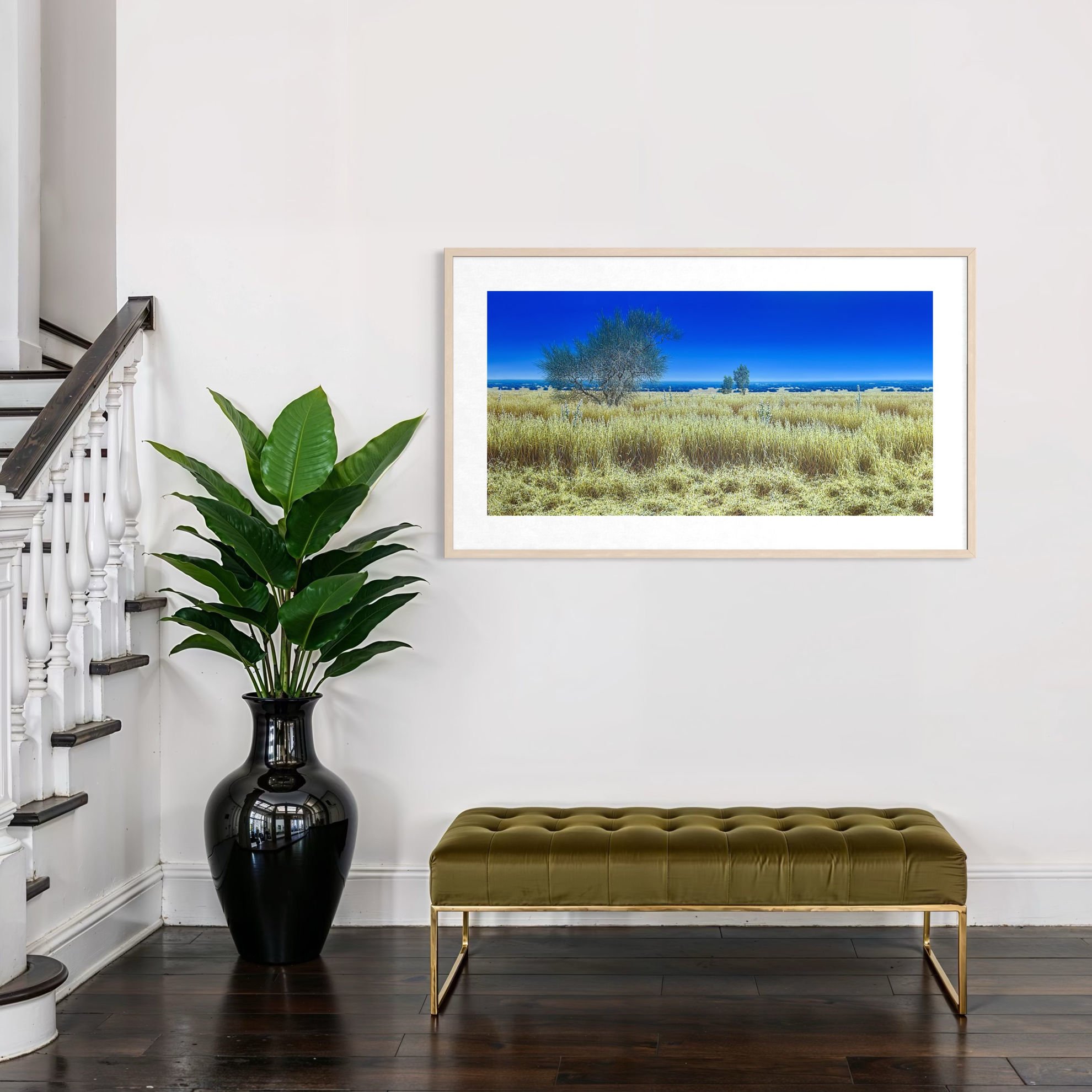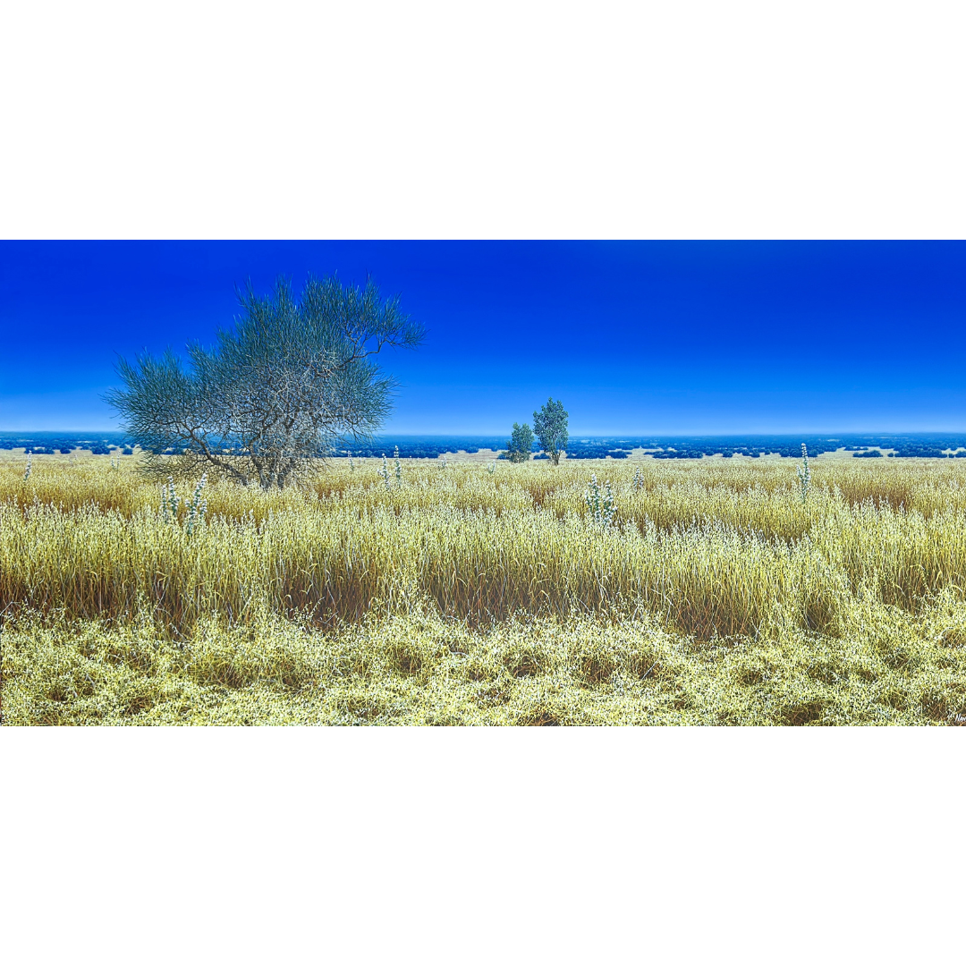 Il giallo del prato domina la scena e si contrappone con decisione all’azzurro terso del cielo: due campi cromatici netti, quasi in dialogo tra loro. È un paesaggio che colpisce per la sua apparente semplicità, privo degli elementi iconici della pittura di Navarra – ulivi, agavi, ginestre e papaveri – che qui lasciano il posto a un terreno arido, assolato, capace di evocare immediatamente la stagione e quasi di far percepire il calore che lo attraversa.