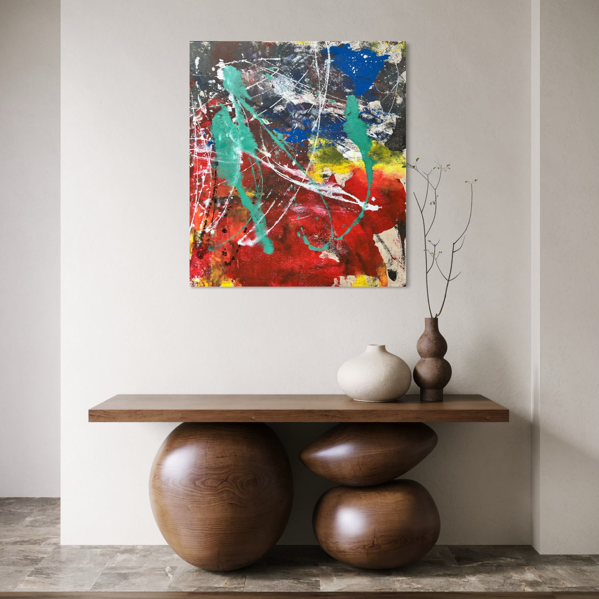 In questa intensa composizione astratta, Matteo Must affida a colori intensi e al gesto una narrazione vibrante e contemporanea. Le stratificazioni di acrilico costruiscono una superficie dinamica, capace di restituire profondità e luce. Un’opera che esprime con forza una ricerca pittorica autentica e riconoscibile. L’opera ben si accompagna, eventualmente, al suo gemello, dal titolo omonimo, che racchiude la stessa tavolozza cromatica, presenta le medesime dimensioni e, pertanto, può essere accostato liberamente in un ambiente più grande che lo consenta. La visione di un dittico sarà estremamente suggestiva, impattante come un’opera grande ma pensata dall’artista in un modulo di 2. La soluzione del dittico presenta l’opportunità di distanziare le due opere in base agli spazi disponibili e agli arredi sottostanti. Una soluzione estremamente contemporanea, funzionale, d’impatto, così come richiede il design più moderno. L’opera è realizzata con tecnica mista su tela e non necessita di cornice.