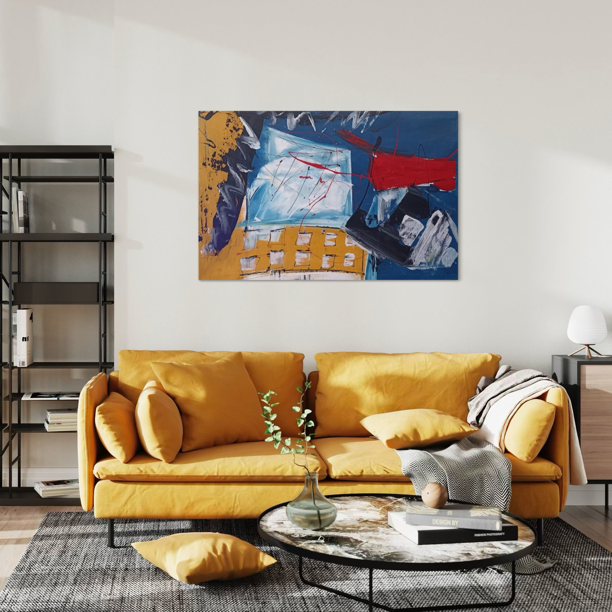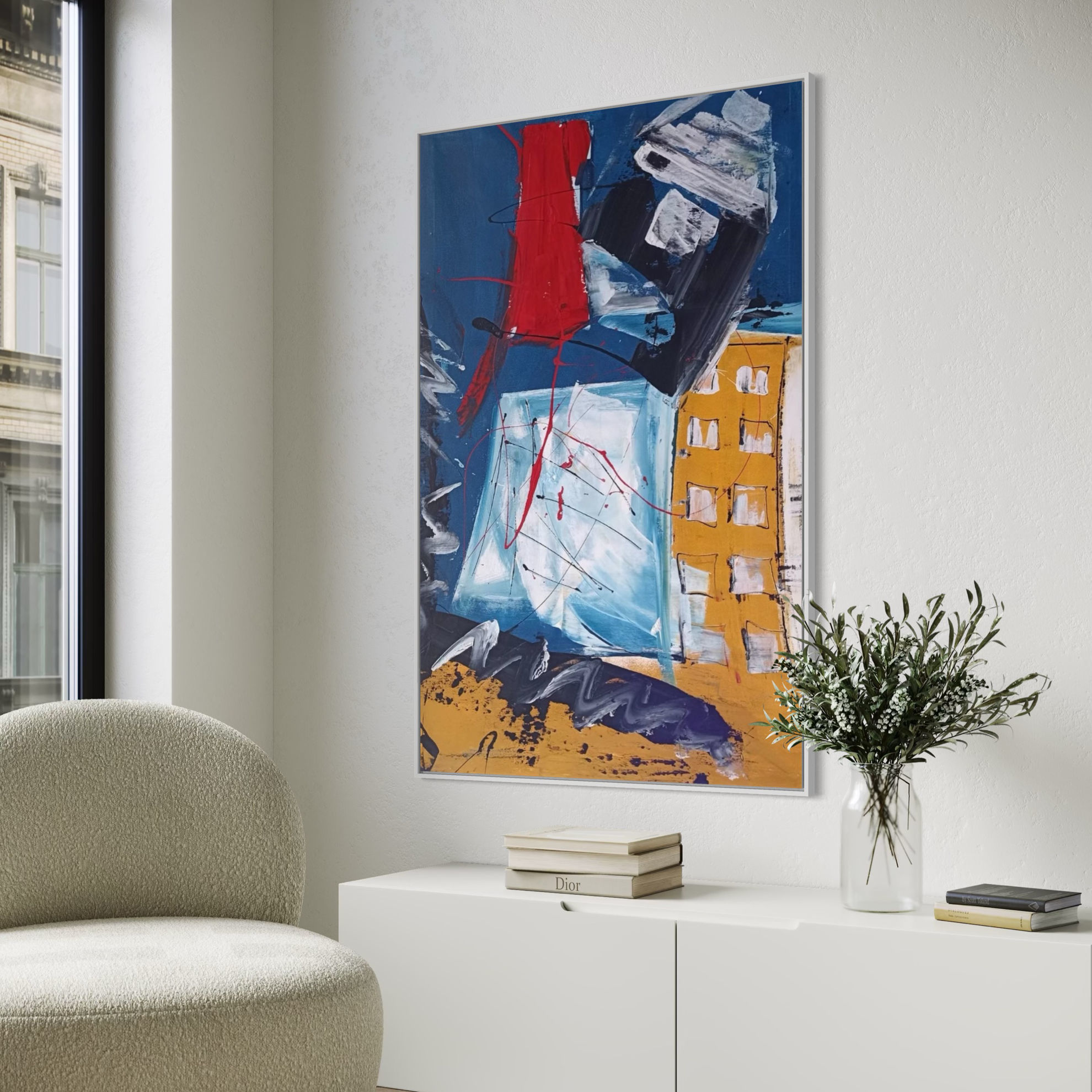 Marco Malfatto, giovane artista romano, qui approda ad una descrizione vagamente astratta di visioni urbane in cui gli elementi presenti in città metropolitane sembrano intrecciarsi e sovrapporsi fra loro. Privo di un puntuale riscontro alla realtà, l’artista sembra volteggiare tra palazzi, viali, automobili in un intreccio libero e onirico di contesti urbani che abitano la sua fantasia. I colori sono audaci, intensi capace di creare forti contrasti in una declinazione cromatica variegata e sfaccettata. Le forme geometriche assimilabili a quadrati, rettangoli o tondeggianti di colori contrastanti rendono queste opere estremamente versatili per ogni ambiente. L’opera, realizzata con colori acrilici, può essere orientata sia orizzontalmente che verticalmente, secondo le esigenze di spazio e la preferenza del fruitore, avendo la firma apposta sul retro.