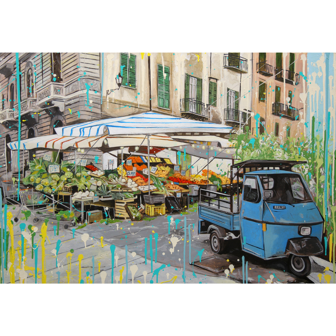 Lapino nel mercato di Ballarò di Marco Favata ritrae uno scorcio autentico di Palermo, città natale dell’artista. La scena si svolge nel cuore pulsante del mercato di Ballarò, teatro quotidiano di una tradizione che resiste al tempo con la sua energia vibrante e i suoi toni accesi. Sul bancone di un fruttivendolo si affollano mercanzie variopinte, mentre sullo sfondo si stagliano i prospetti vissuti dei palazzi. Accanto, una moto Ape è parcheggiata con naturalezza: non solo mezzo di trasporto, ma simbolo iconico di un’identità culturale, memoria visiva del passato che ancora abita il presente.Favata racconta Palermo come un organismo vivo, dove il tempo non cancella ma stratifica, dove ogni angolo conserva il ricordo di ciò che è stato e lo trasmette con forza al futuro. Il suo sguardo non è mai fermo: celebra il vissuto e allo stesso tempo lo rielabora in chiave contemporanea. L’opera, luminosa e solare, è curata nei dettagli: dai colori delle tende alle texture delle merci, ogni elemento partecipa alla narrazione. Particolarmente poetica è la resa della moto Ape, elevata a simbolo, presenza familiare che parla direttamente al cuore dell’osservatore. La rifinitura finale, realizzata con colature e schizzi di colore acrilico, è cifra stilistica dell’artista: un gesto pittorico che evoca movimento, energia, stratificazione del tempo. Un’esplosione visiva che traduce in forma e colore il continuo divenire della città, carico di memoria e positività.