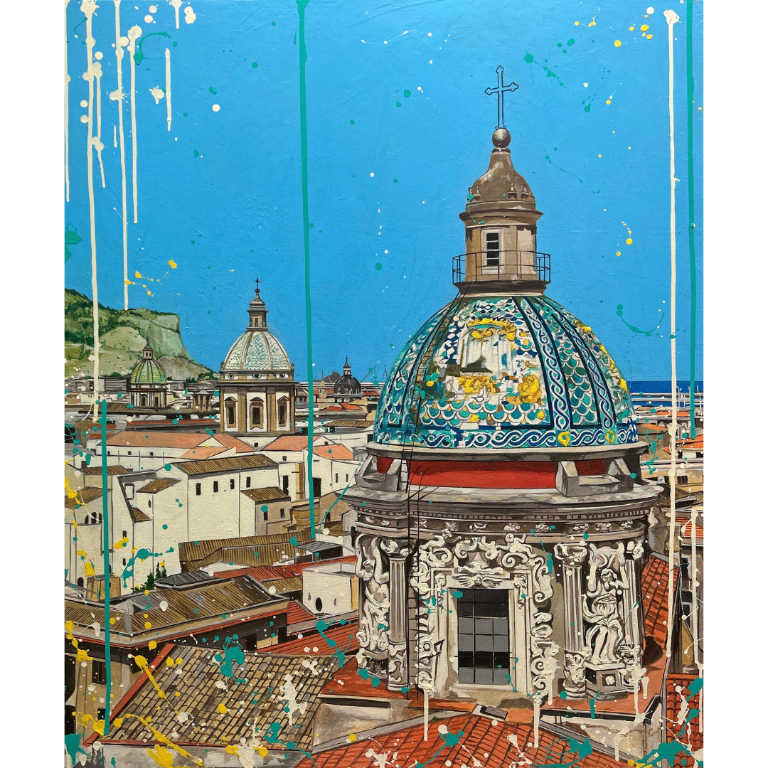 In questa opera, Marco Favata celebra uno dei simboli più affascinanti di Palermo: le cupole della città. Un soggetto caro all’artista che torna a esplorare con uno sguardo nuovo e suggestivo, quello delle visioni dall'alto della città. La luce, elemento cardine dell’opera, sembra scivolare sulle superfici delle cupole, evidenziando i dettagli con un’intensità realistica, ma al contempo astratta, rintracciando una chiave interpretativa assolutamente contemporanea. Il cielo di un azzurro intenso, avvolge la città in un’atmosfera poetica e sospesa. Le tipiche colature verticali, segno distintivo dell’artista, creano un dialogo dinamico tra architettura e colore, tra memoria e presente.Favata racconta Palermo attraverso i suoi luoghi più iconici, ma lo fa con uno stile contemporaneo e personale, che unisce il realismo architettonico alla forza espressiva del colore. In quest’opera, il passato e il presente si incontrano in una visione emozionante e intensa, capace di catturare lo sguardo e il cuore. Un’opera che sintetizza l’arte urbana, i paesaggi architettonici e l’inconfondibile bellezza della sua città natale.Il formato di grandi dimensioni lo rende un protagonista unico dei vostri ambienti.
