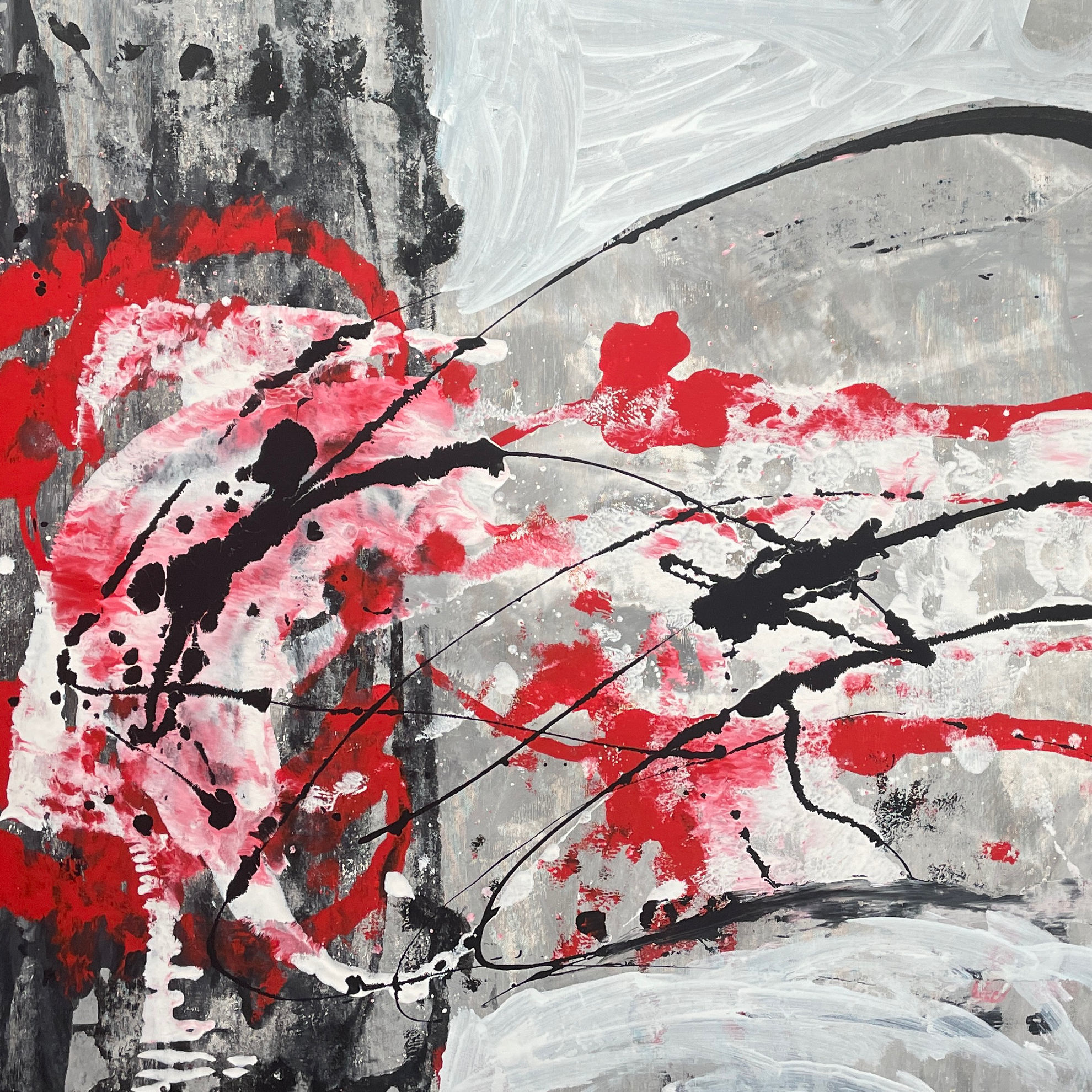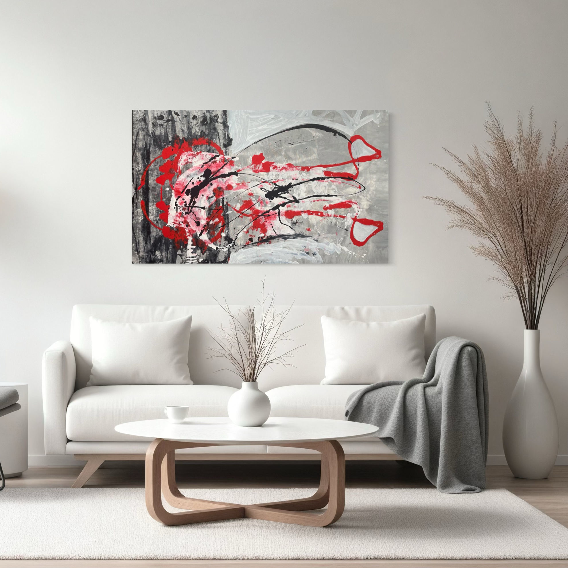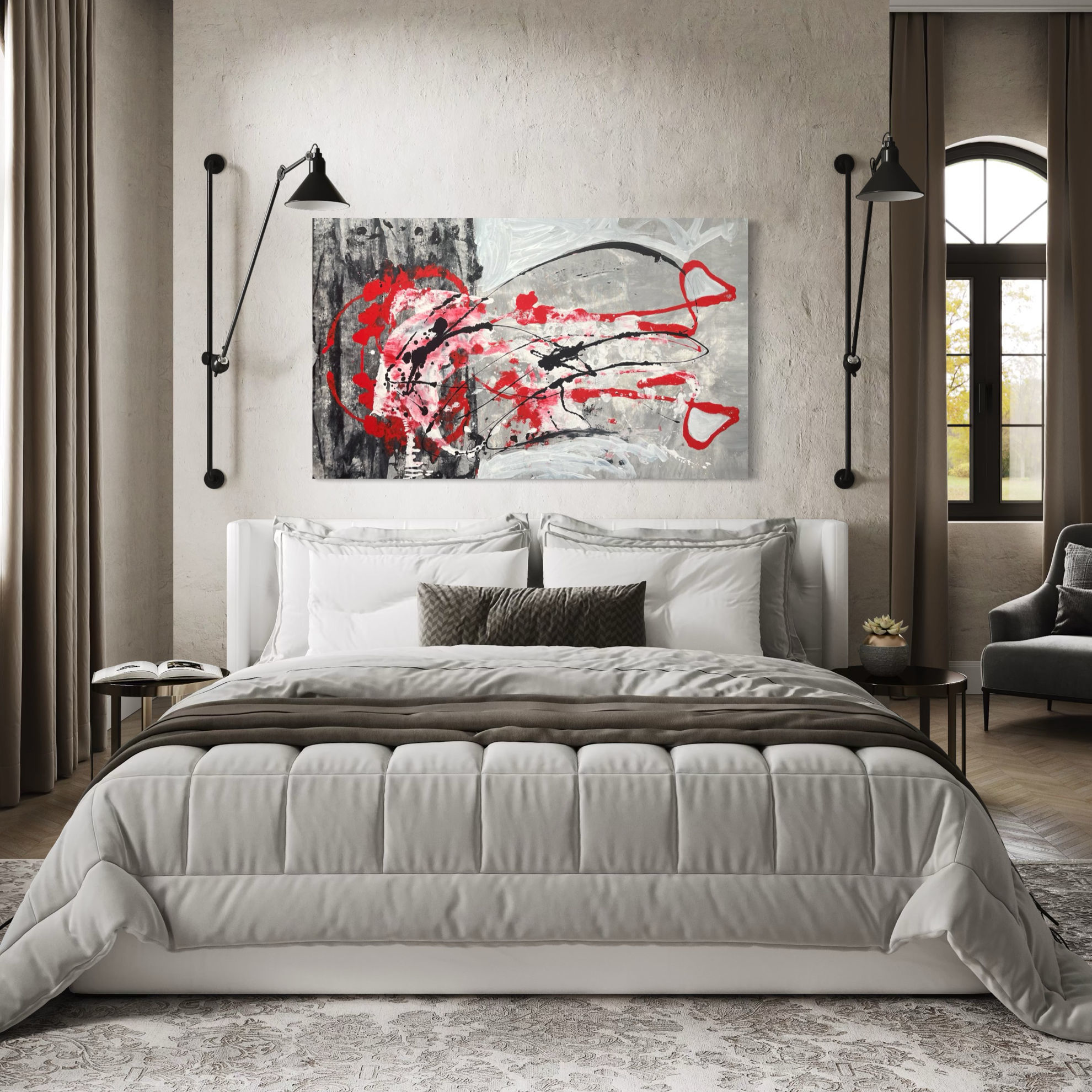 Opera di grande formato, dai cromatismi intensi in cui il black&white è spezzato da un rigolo di colore rosso che ne segna un filo di passione, sangue, amore. Il giovane artista Matteo Must sceglie una tela di grande formato per realizzare un’opera molto impattante dall’effetto estetico intenso, capace di donare all’ambiente un mood contemporaneo e di forte personalità, senza paura di osare. L’opera consente un orientamento libero, in senso orizzontale o verticale, in base all’esigenza dell’ambiente e dell’arredo.
