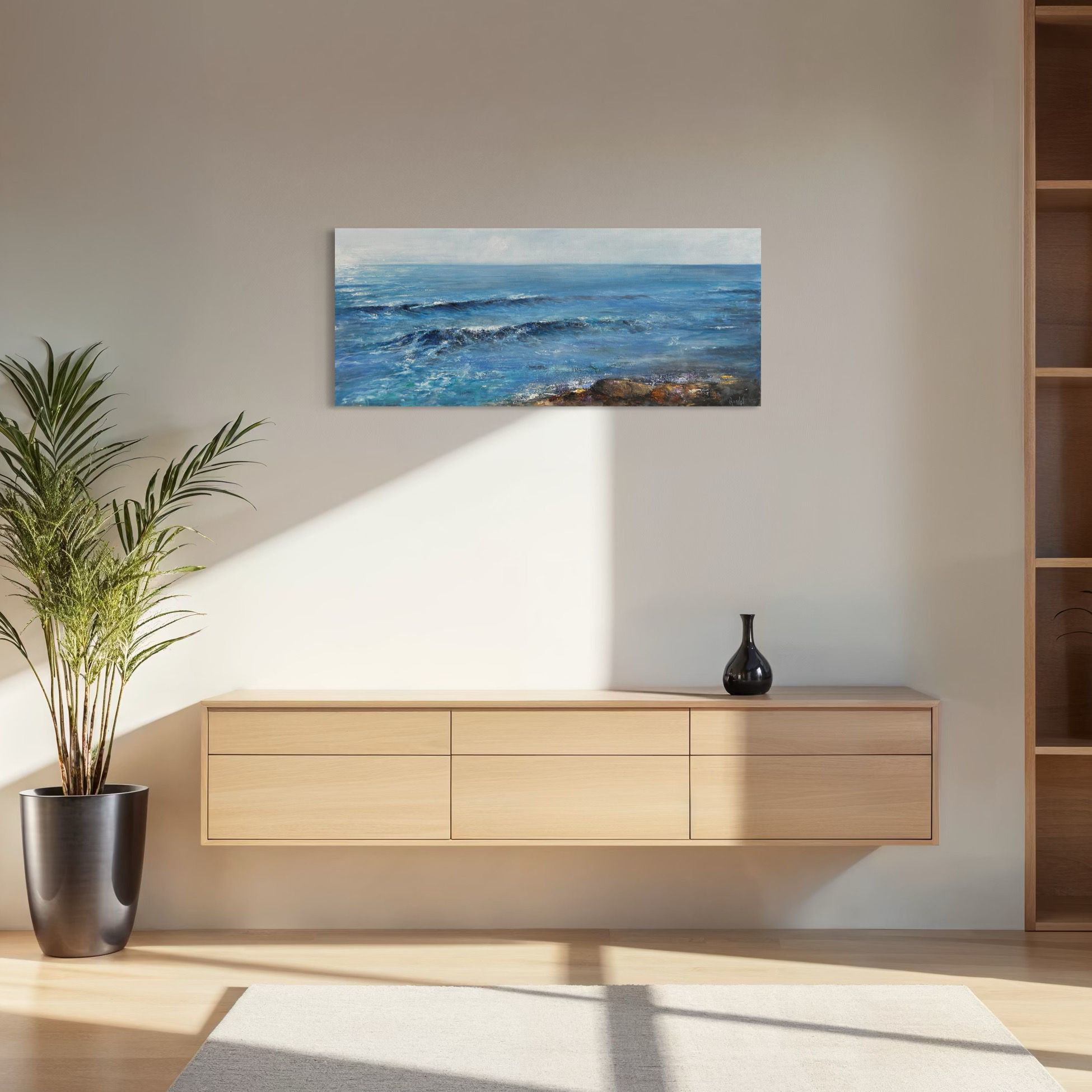 Nei paesaggi marini d iGiacomo Angiletti, il mare diventa protagonista assoluto e spazio di contemplazione. Attraverso una pittura ad olio contemporanea, l’artista siciliano costruisce orizzonti profondi e avvolgenti, dove luce, colore e atmosfera mediterranea dialogano in perfetto equilibrio tra osservazione e astrazione. I riflessi del mare al tramonto sono soggetti ricorrenti, interpretati con pennellate materiche e vibranti, capaci di restituire sensazioni di quiete, memoria e sospensione temporale. Lo sguardo si perde verso l’infinito, accompagnato da una prospettiva ampia che invita alla riflessione e al silenzio interiore.