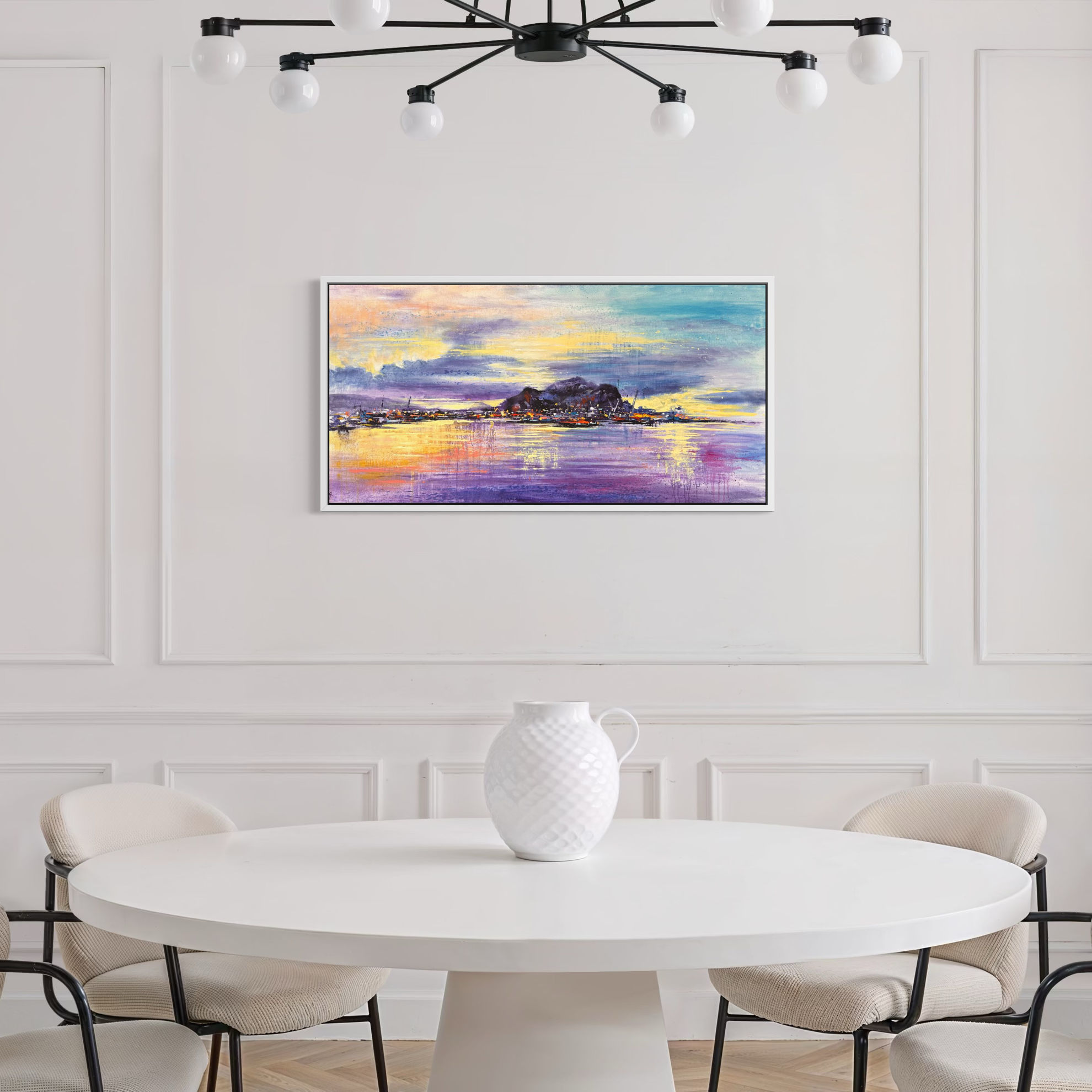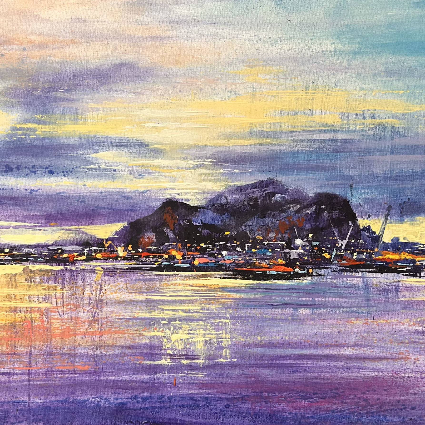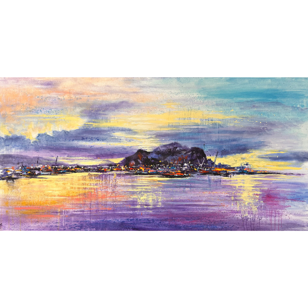 In quest’opera ad olio su tela, Tano Angiletti cattura una veduta panoramica del porto di Palermo al calare del sole, restituendo con forza espressiva tutta la vibrante intensità della città affacciat sul suo golfo. L’artista sceglie un punto di osservazione elevato, da cui domina l’ordito urbano che si perde all’orizzonte, incorniciato dalle montagne. La luce dorata del tramonto incendia il cielo, dove il giallo si fonde con tonalità violacee e rosate, creando un fondale emozionale e scenografico. La città, dipinta con tocchi dinamici e accesi, sembra pulsare di vita: ogni pennellata è un accento di colore, ogni forma suggerisce un brulicare urbano, colto nell’attimo in cui la giornata si spegne ma la bellezza rimane sospesa.L’artista di origine ragusana manifesta nelle sue opere il profondo legame con il territorio in una narrazione descrittiva che sa elevarsi attraverso una lettura più sintetica e astratta.L’uso sapiente delle cromie restituisce anche i chiaroscuri, le profondità, i primi piani e le prospettive più lontane in un gioco di luci e ombre sapiente e suggestivo.