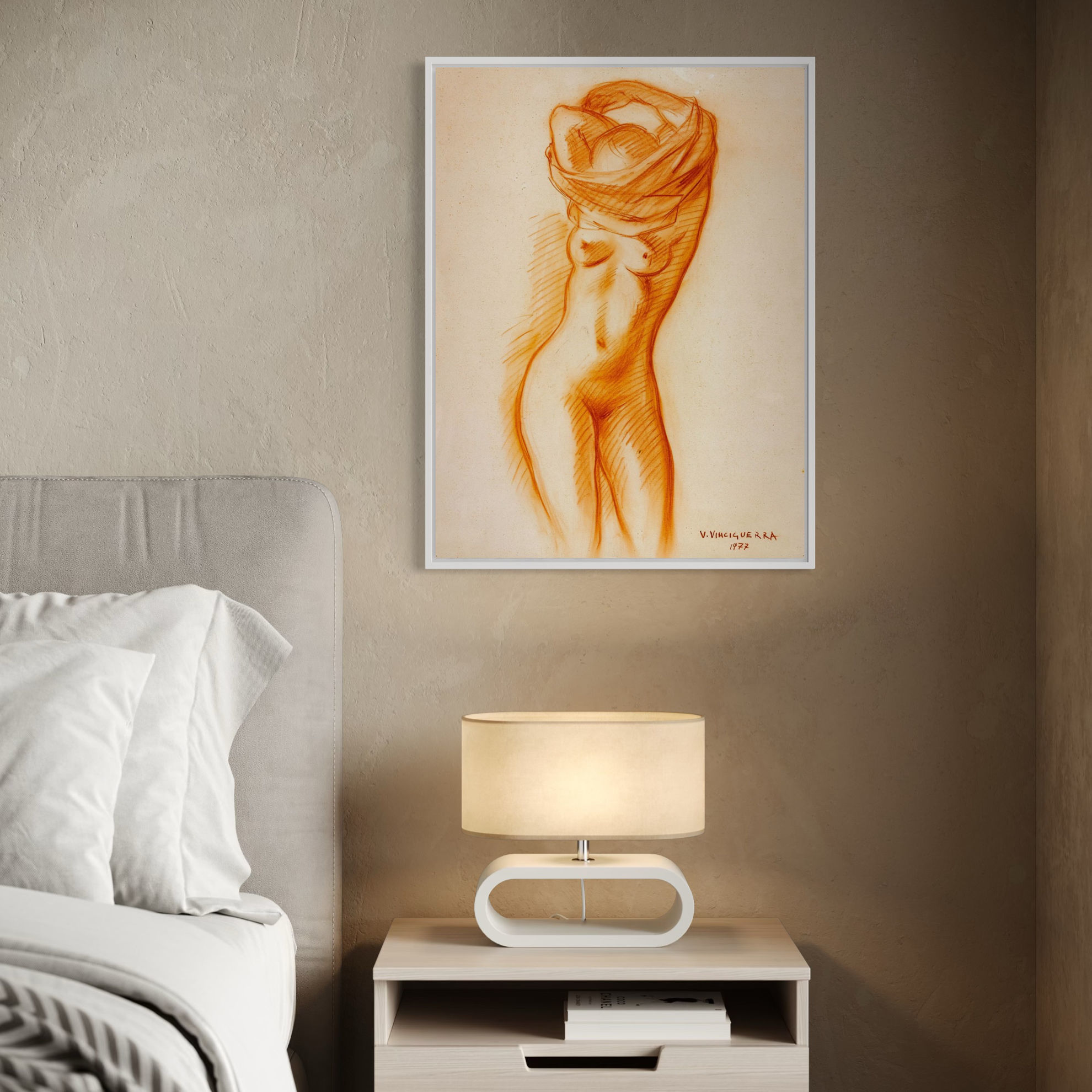 Se le pitture da sole hanno un loro linguaggio quanto mai chiaro e preciso, questo eccede osservando con attenzione gli studi e i disegni sia a grafite che a sanguigna. Il singolare potere di sintesi dell'artista, l'intelligenza che lo governa e la continua evoluzione creatrice che sviluppa di opera in opera, nei, per così dire, “bozzetti”, si profilano con nettezza, diventando quasi un motivo fresco e garbato che all'improvviso esplode in accensioni di altissimo tono, intenzionale, teso a rompere le eccessiva musicalità dello schema nel quale rischiano di inquadrarsi. Disegno a sanguigna di Vincenzo Vinciguerra raffigurante "Nudo di fronte" datato 1977, firmato e datato dall'artista in baso a destra.