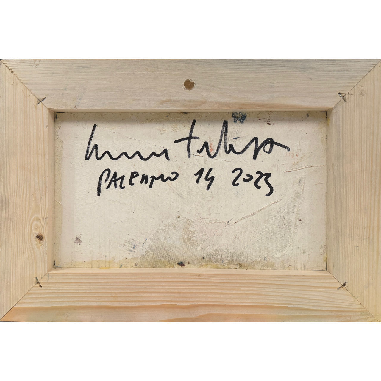 DESCRIZIONE Particolarissima opera unica di Croce Taravella, olio su alluminio di misure 28x41 cm decicata a Palermo. Il dipinto è firmato nel retro, in nero, del 2023.