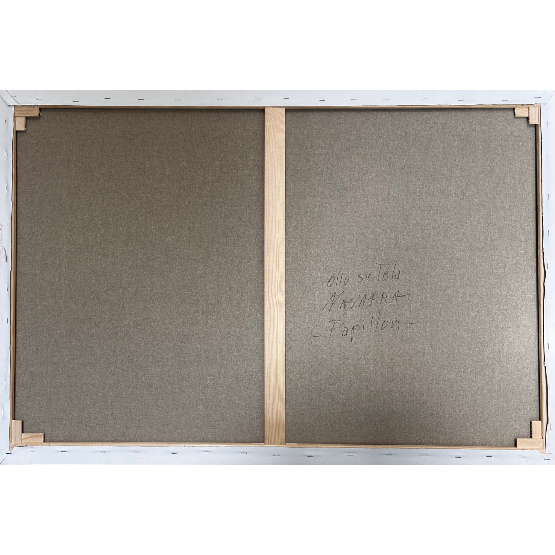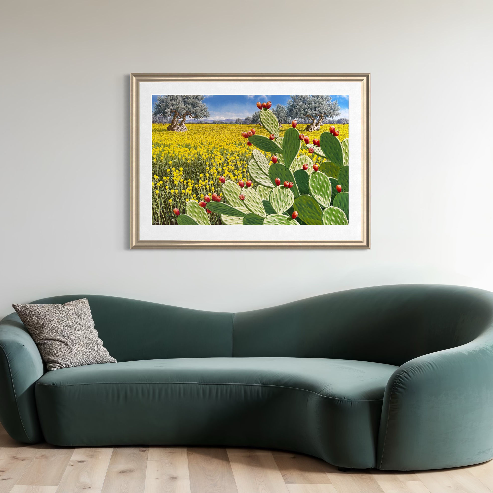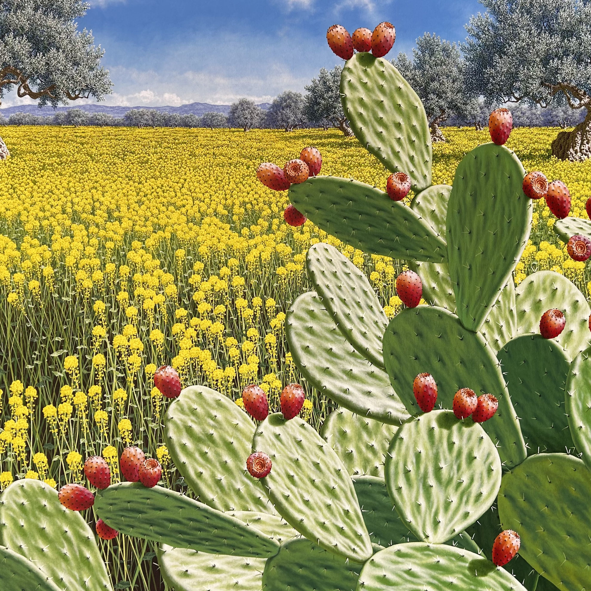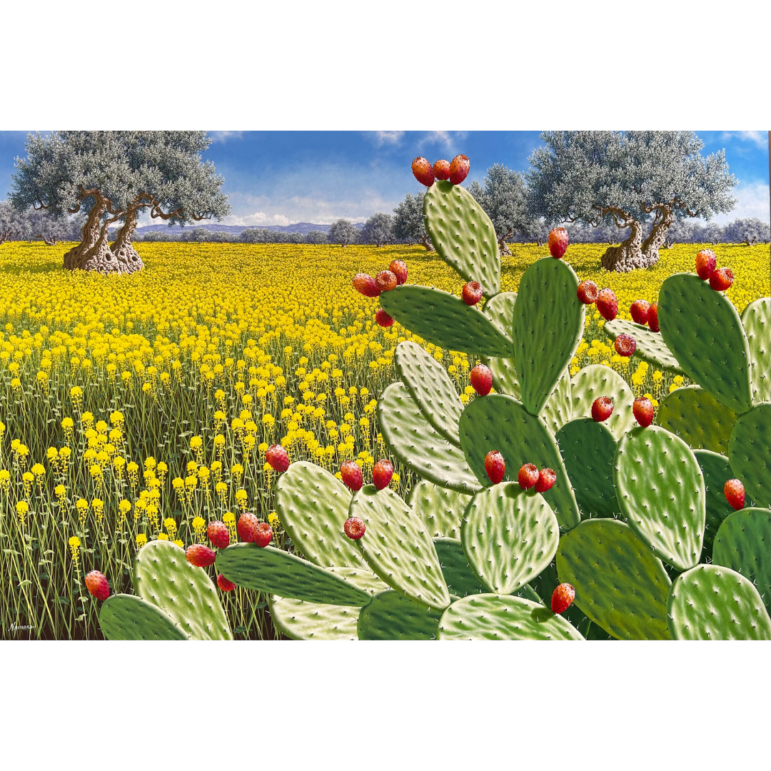 In quest’opera iperrealista, il maestro Navarra ci trasporta nel cuore del dell'entroterra siciliano. La scena è dominata da una rigogliosa distesa di fichi d’India, dipinti con una resa meticolosa che ne esalta la matericità, mentre sullo sfondo, si perdono a vista d'occhio una distesa di ulivi, dai tronchi nodosi e le fronde cariche che si stagliano verso il cielo. Una fitta distesa di ginestre accende ed esalta la scena con tocchi di giallo acceso, evocando la vegetazione spontanea del paesaggio siciliano. Un vero tributo alla luce e ai colori del Sud, eseguito con una tecnica pittorica impeccabile.