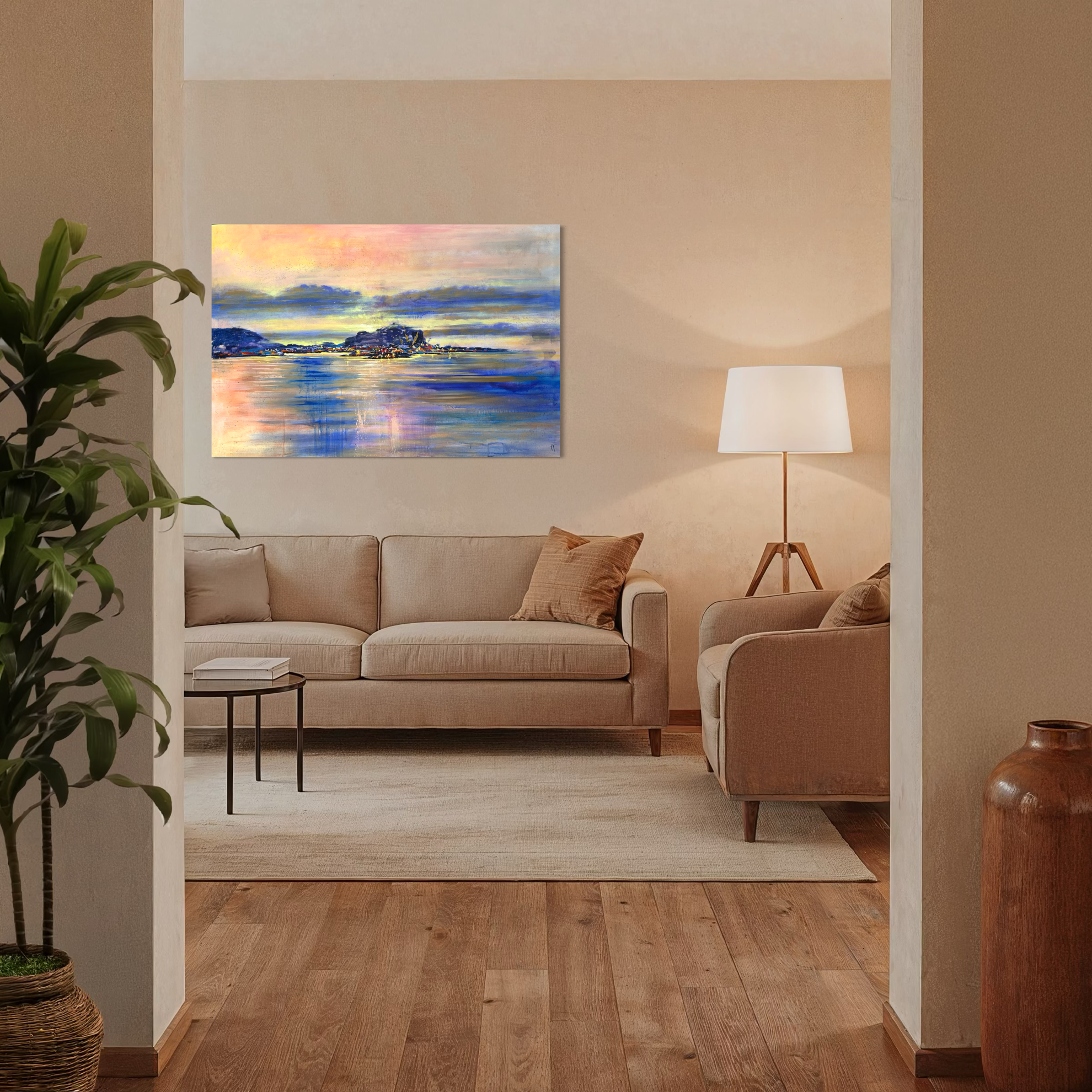 Nei paesaggi marini di Tano Angiletti, il mare diventa protagonista assoluto e spazio di contemplazione. Attraverso una pittura ad olio contemporanea, l’artista siciliano costruisce orizzonti profondi e avvolgenti, dove luce, colore e atmosfera mediterranea dialogano in perfetto equilibrio tra osservazione e astrazione. Monte Pellegrino sullo sfondo, il porto e i riflessi del mare al tramonto, sono soggetti ricorrenti, interpretati con pennellate materiche e vibranti, capaci di restituire sensazioni di quiete, memoria e sospensione temporale. Lo sguardo si perde verso l’infinito, accompagnato da una prospettiva ampia che invita alla riflessione e al silenzio interiore.