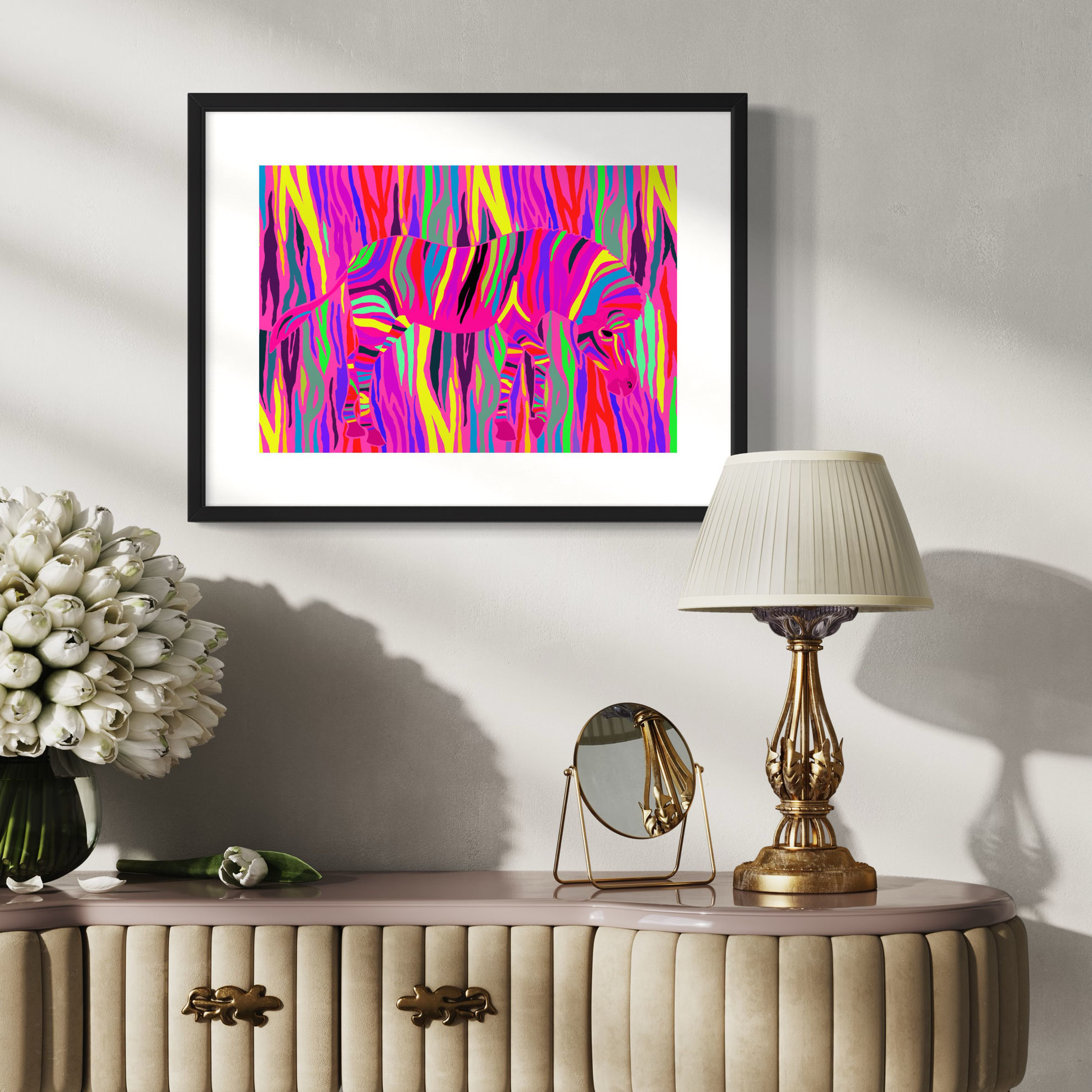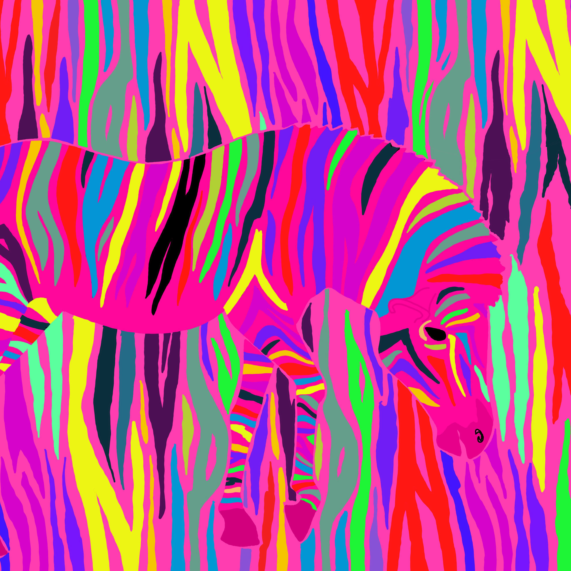 Su uno sfondo vivace, una zebra dai contorni decisi si staglia con orgoglio. Le sue strisce colorate, rese ancora più audaci da una spruzzata di colori neon, si trasformano in un vortice di energia. La zebra, in questa rappresentazione pop, non è solo un animale selvatico, ma un'icona di personalità e libertà sfrenata. Un gioco cromatico audace in cui il fondo assume gli stessi vibranti disegni delle strisce del manto.