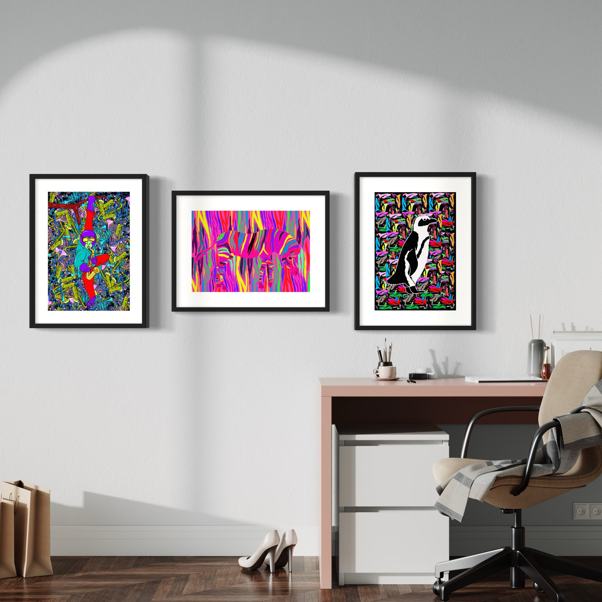 Queste tre stampe digitali della serie "Zoo Pop", ispirate dall'opera di un artista che fonde la realtà animale con la fantasia pop, catturano l'essenza di creature selvagge trasformate in icone di personalità, divertimento e stile. I colori vivaci, i contrasti audaci e le espressioni giocose creano un'atmosfera surreale e onirica, invitando lo spettatore a immergersi in un mondo dove l'immaginazione regna sovrana.
