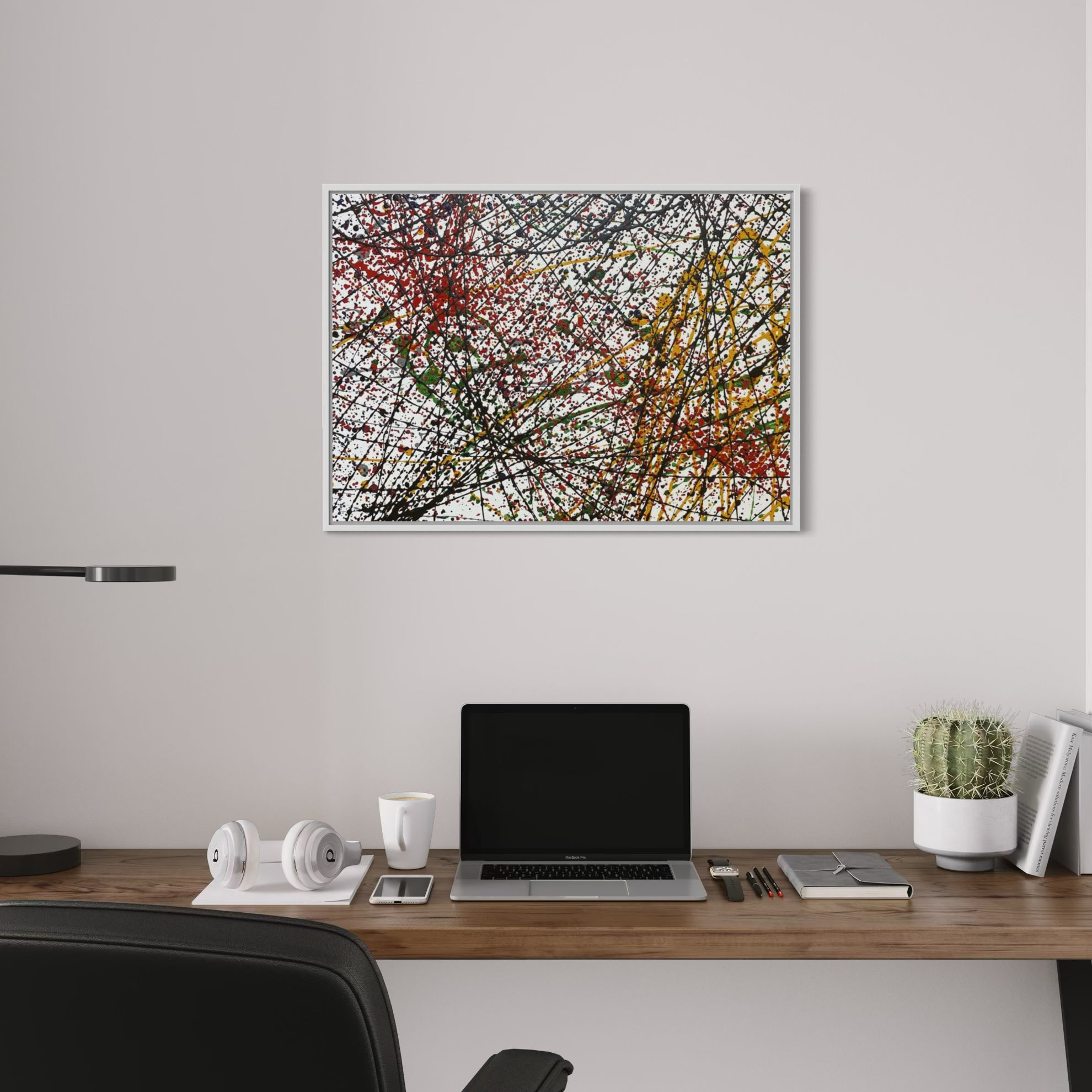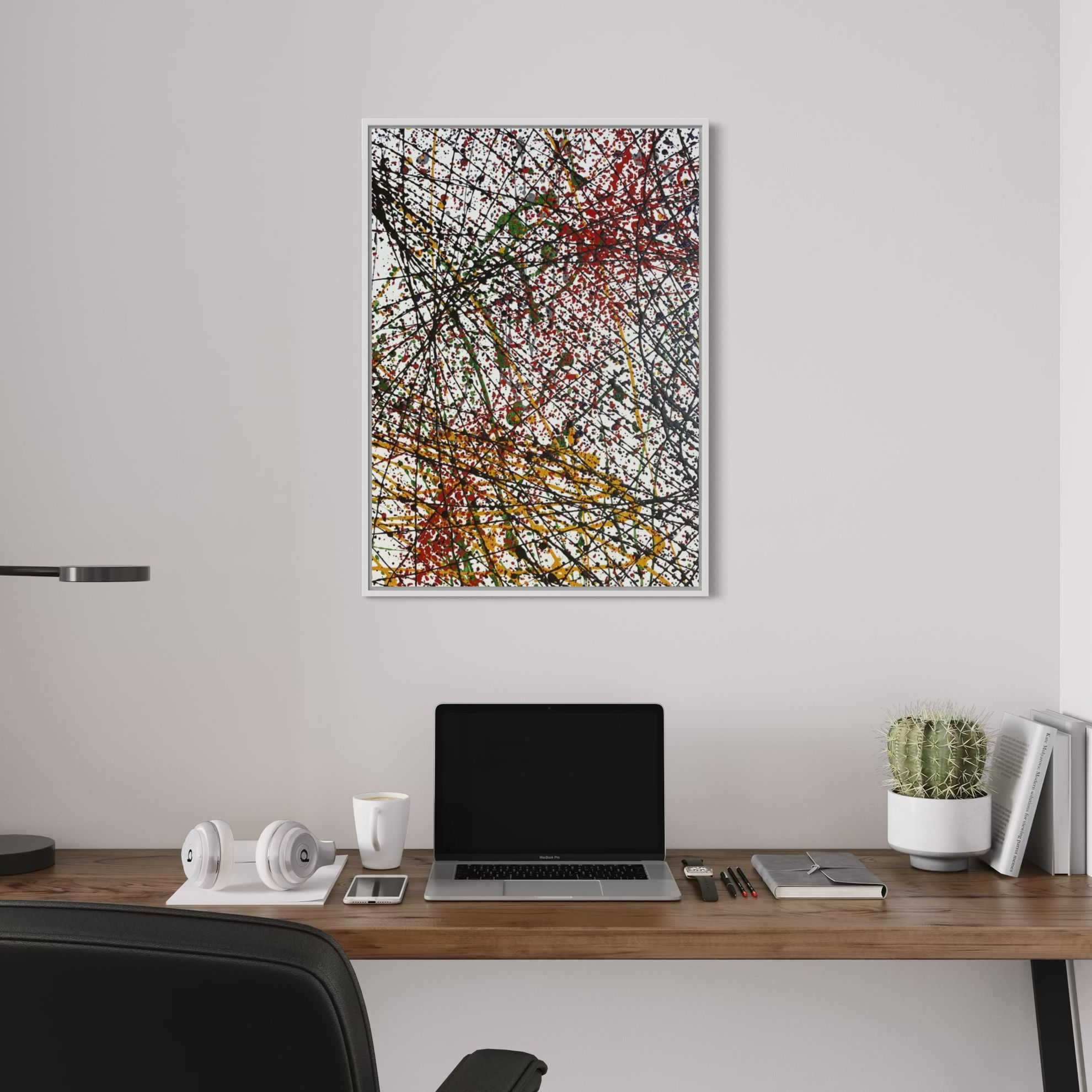 Opera unica dell’artista Claudio Cangialosi realizzata a tecnica mista con smalti su tela In questa occasione lavora con un formato più piccolo, un'eccezione nella tecnica pittorica utilizzata. L’artista continua con la sua serie astratta nella cui, attraverso la tecnica del drippin, crea composizioni di grande dinamismo e movimento. Sulla tela, visibile come sfondo bianco, si mescolano le infinite linee e gocce a colore verde, rosso, giallo e nero, componendo un’opera astratta di grande espressività.