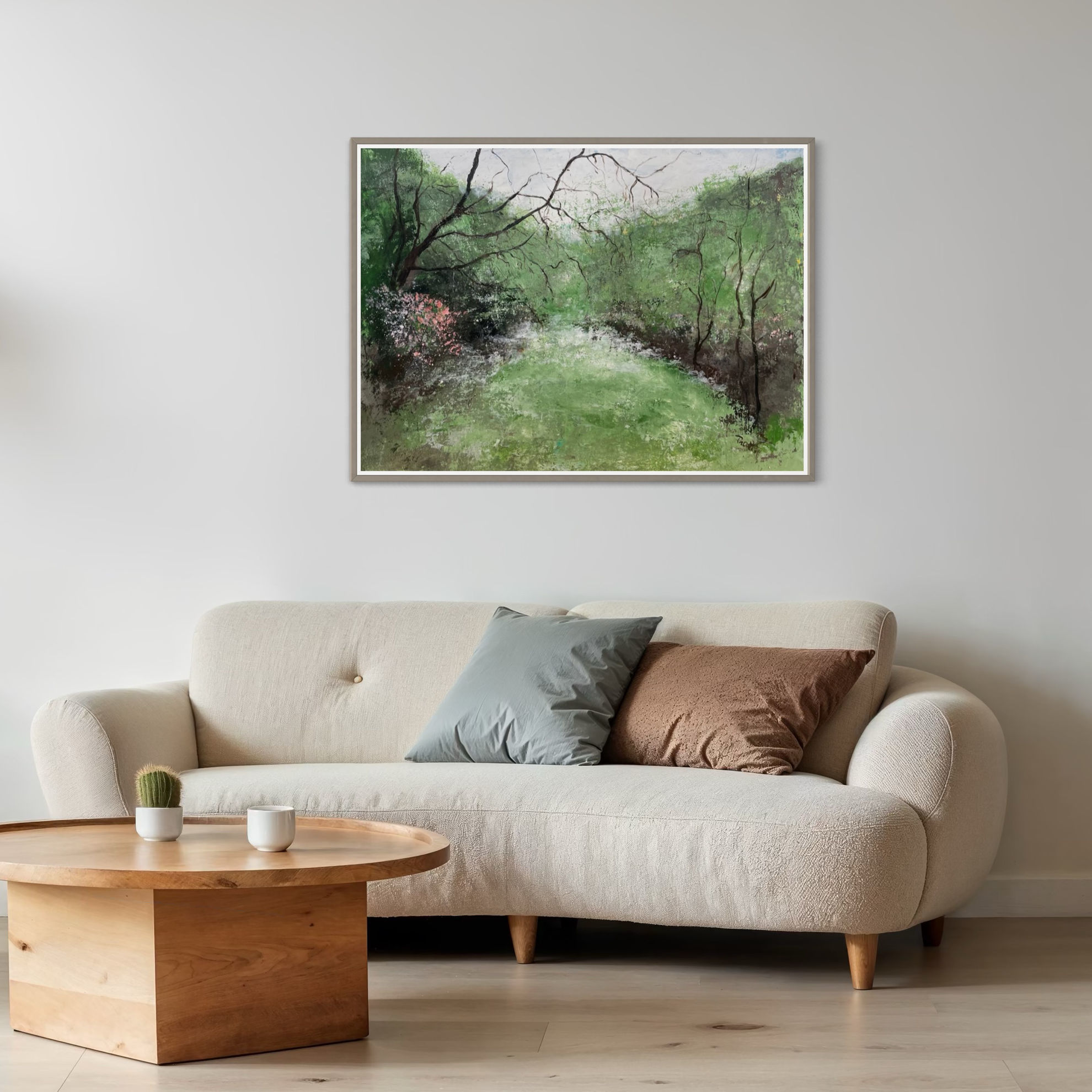 Oreto, uno dei pochi fiumi che attraversa la città di Palermo, città di origine dell’artista, è qui il soggetto protagonista di un’opera di grandi dimensioni realizzata con colori a smalto lucido su tela. Una fitta vegetazione si intreccia come una selva riempendo il letto del fiume con grovigli di rami e arbusti. Il letto del fiume rispecchia cromaticamente le sterpaglie e gli arbusti che lo sovrastano, creando una composizione quasi speculare in cui il verde campeggia in una declinazione ricca di sfumature, contrastato soltanto da rami scuri che l’attraversano. Tocchi delicati di rosa, come fossero cespugli di fiori, spezzano la monocromia donando gentilezza e romanticismo ad un’opera dalla forte personalità.