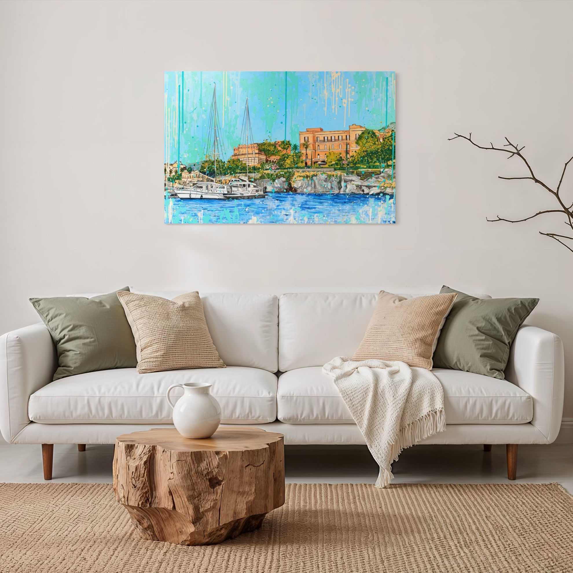 Attraverso una paziente perlustrazione in barca, l'artista ha potuto catturare una visione suggestiva dell'edificio, visto dal mare. Questa prospettiva inusuale conferisce all'opera un fascino rivelatore della storia che si cela dietro quelle mura. Un luogo del cuore dell’artista, un ricordo d’infanzia che diventa una finestra sul passato, un ponte tra il presente e la memoria In primo piano, il mare vibrante nei suoi moti leggeri, scintillante di sfumature, variegato e chiaro riflette i raggi del sole. Le imbarcazioni a vela evocano atmosfere romantiche di un tempo lontano.