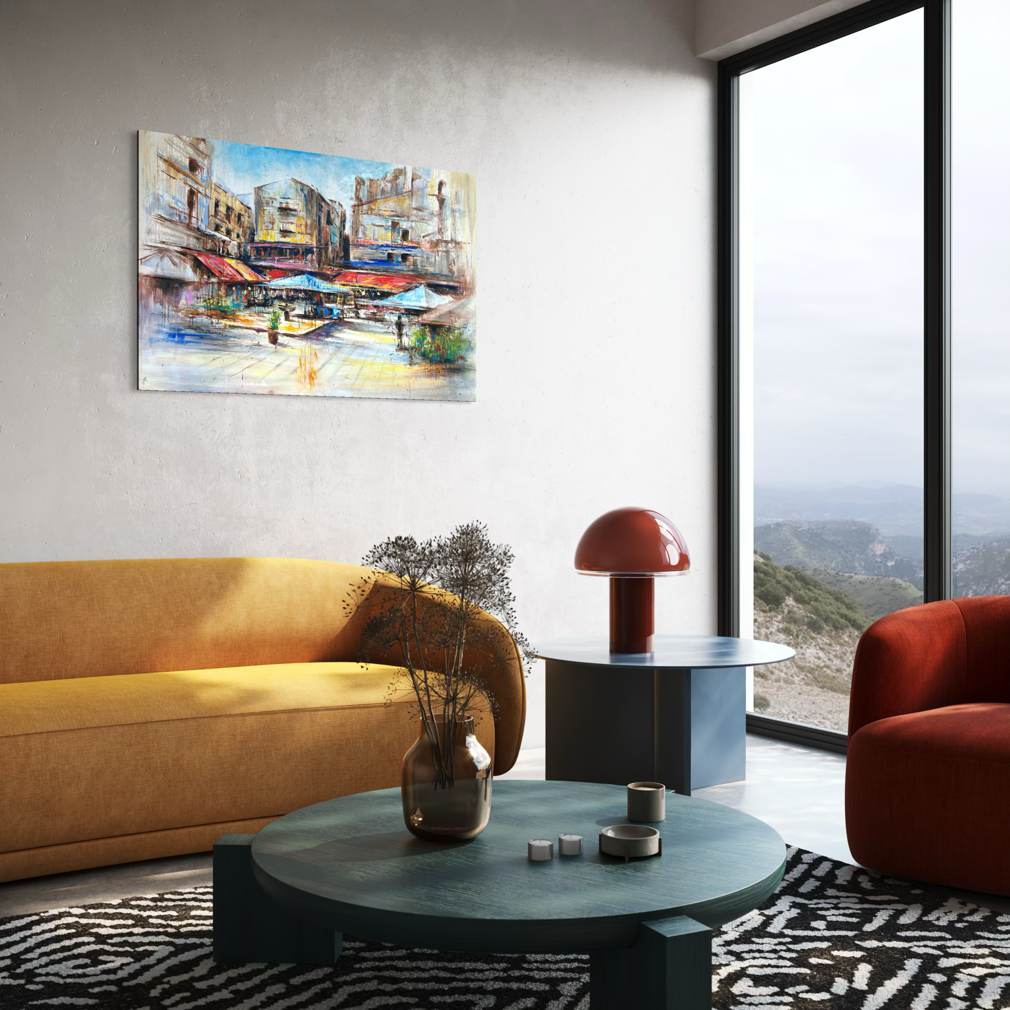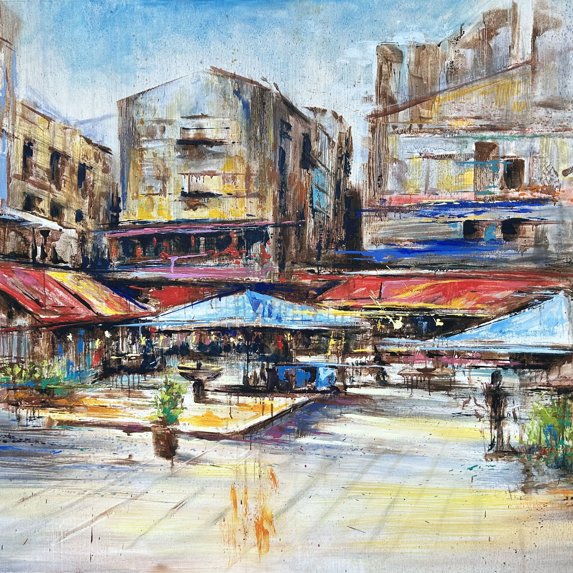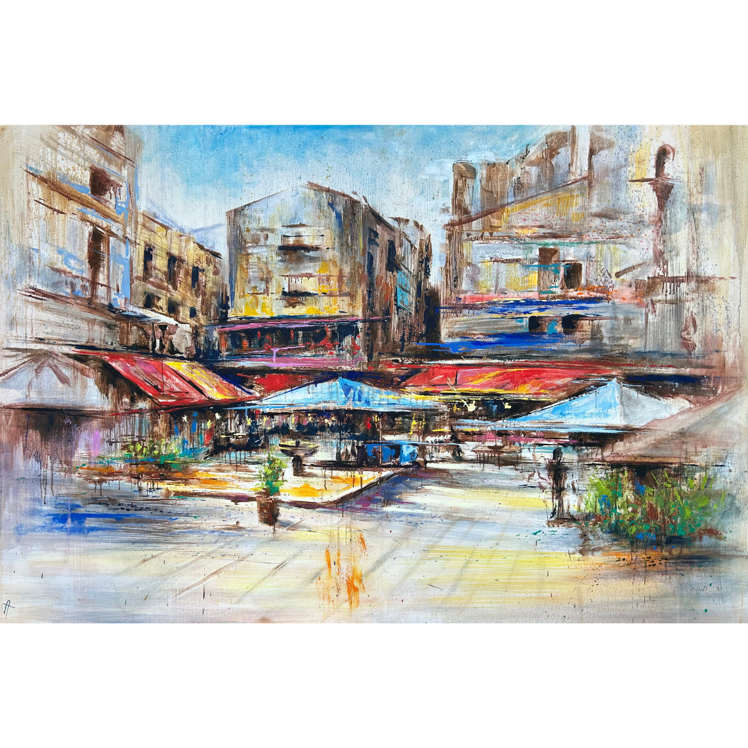 Questa opera di Tano Angiletti, dedicata alla Vucciria, rappresenta un’interpretazione vibrante di uno dei luoghi più iconici e popolari di Palermo. Si tratta di un’opera che unisce energia urbana, stratificazione storica e vitalità contemporanea, nel solco della sua cifra stilistica inconfondibile. L’opera non racconta solo il luogo, ma ne trasmette il ritmo, il suono e il vissuto; è come se si potessero sentire le voci del mercato.